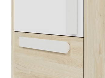 Drop 04 to bieliźniarka złożona z zestawu pojemnych półek pozwalających na prostą organizację garderoby. Wykonano ją z odpornej na wysoką temperaturę, wilgoć i zarysowania płyty laminowanej w kolorze buk fjord. O jeszcze większą trwałość Drop 04 dbają obrzeża ABS przeciwdziałające zniszczeniom spowodowanym przez uderzenia. Natomiast wyjątkową stylistykę mebla gwarantuje biały front drzwi wyposażony w duże, geometryczne uchwyty.