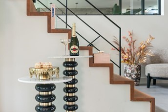 - Okrągły blat z białego marmuru, dodający wnętrzu klasycznej elegancji