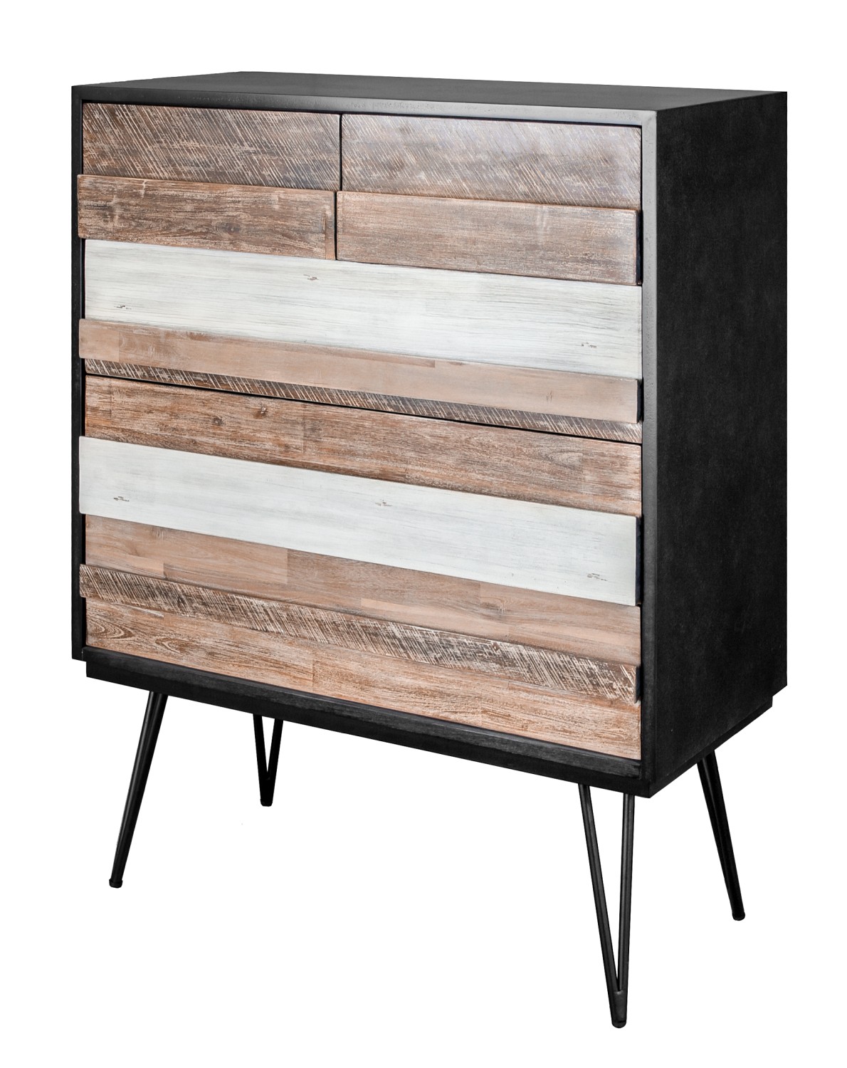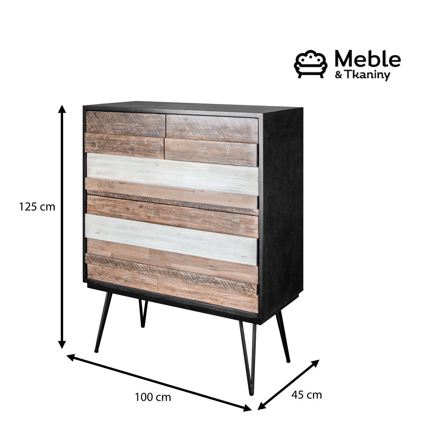 Połączenie stylu industrialnego z rustykalnym... Czy to może się udać? Jeśli spodobała Ci się zamieszczona na zdjęciu komoda, to wygląda na to, że tak! Na jej metalowych, charakterystycznie wygiętych nogach oparto ciemnoszary korpus okalający frontyszafek. Ich naturalnie odmienne odcienie poszczególnych desek zawdzięczyć można wysokiej jakości drewnu akacji. Spokojnie, przed zamontowaniem zadbano o to, by żadna drzazga nie ograniczyła przyjemności z użytkowania komody. Jeśli zaś przedstawiony model jest dla Ciebie zbyt duży - koniecznie sprawdź model B04!