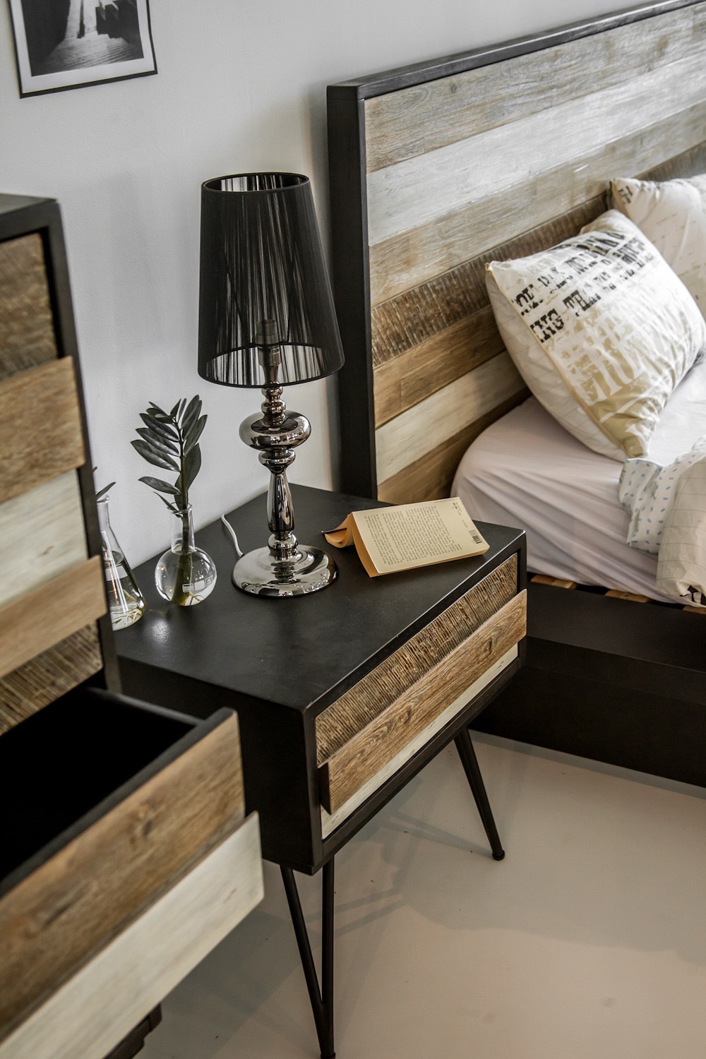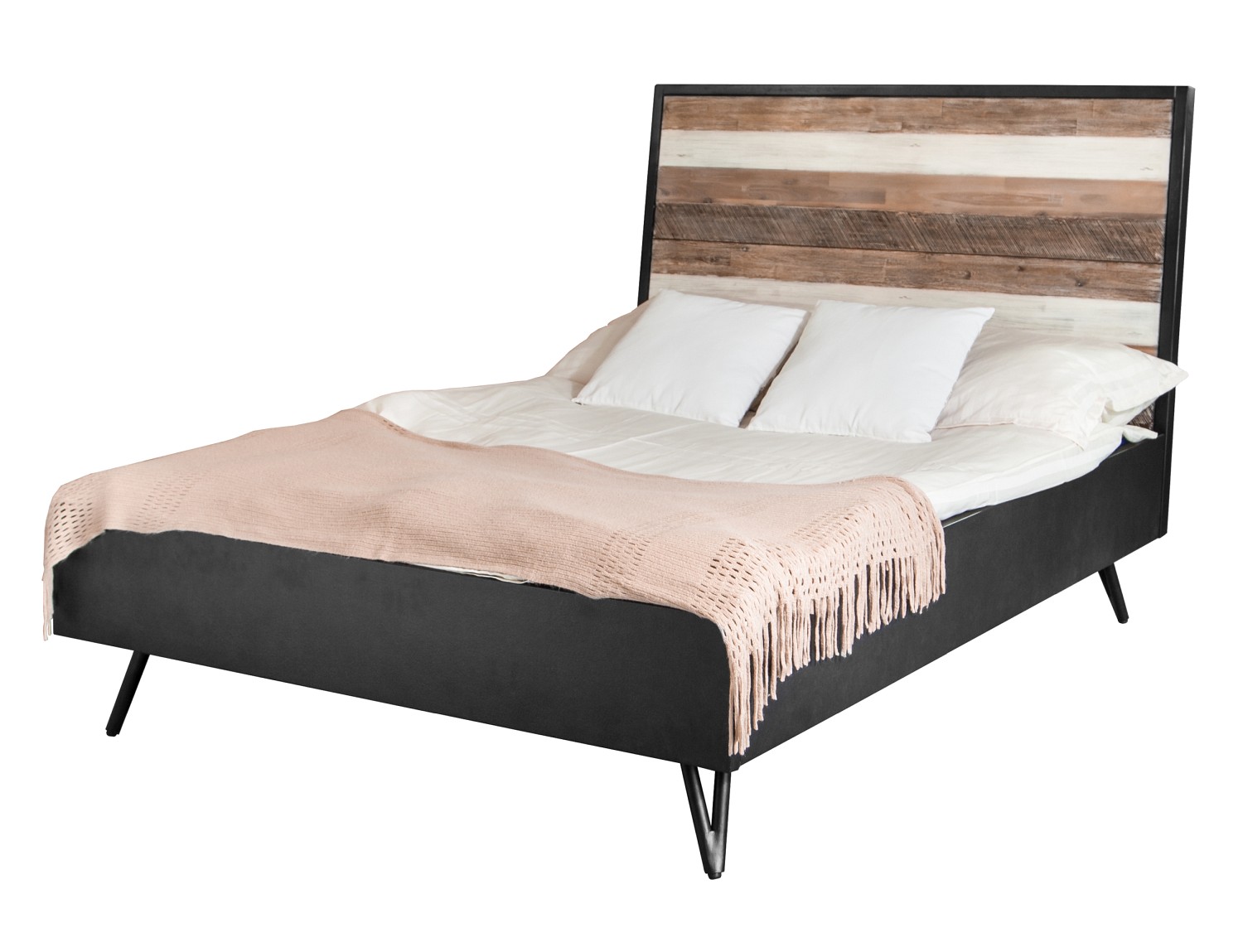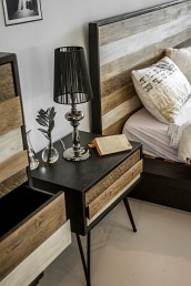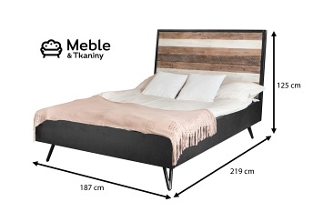 Połączenie stylu industrialnego z rustykalnym... Czy to może się udać? Jeśli spodobało Ci się zamieszczone na zdjęciu łóżko, to wygląda na to, że tak! Na jego metalowych, charakterystycznie wygiętych nogach oparto ciemnoszary korpus, którego rozmiar odpowiada wymiarom większego materaca dwuosobowego. Jeśli zaś kontynować temat oryginalnego wyglądu tego łózka, to nie sposób nie zwrócić uwagi na zagłówek. Naturalnie odmienne odcienie poszczególnych jego desek zawdzięczyć można wysokiej jakości drewnu akacji. Spokojnie, przed zamontowaniem zadbano o to, by żadna drzazga nie ograniczyła przyjemności z użytkowania łóżka.