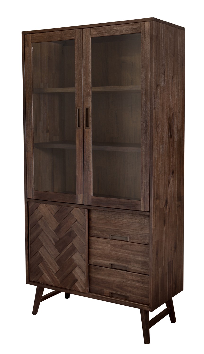 ASHTON, czyli przykuwające uwagę detale. Klasyczne, ciemnobrązowe drewno akacji, z którego wykonano witrynę, wyróżnia się niezwykłą strukturą ułożenia poszczególnych desek. Mimo, iż zdają się być jednakowymi elementami, ich ułożenie tworzy coś na kształt plecionki. To ona zapewnia wyjątkowy charakter mebla. Dolne szuflady wyposażono w stylowe uchwyty, zaś półki przykryte zostały podwójnymi, przeszklonymi drzwiami.