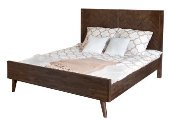 ASHTON, czyli przykuwające uwagę detale. Klasyczne, ciemnobrązowe drewno akacji, z którego wykonano łóżko, wyróżnia się niezwykłą strukturą ułożenia poszczególnych desek. Mimo, iż zdają się być jednakowymi elementami, ich ułożenie tworzy coś na kształt plecionki. To ona zapewnia wyjątkowy charakter mebla. Jego wymiary odpowiadają rozmiarowi mniejszego materaca dwuosobowego. Jeśli potrzebujesz czegoś większego, sprawdź model K01.