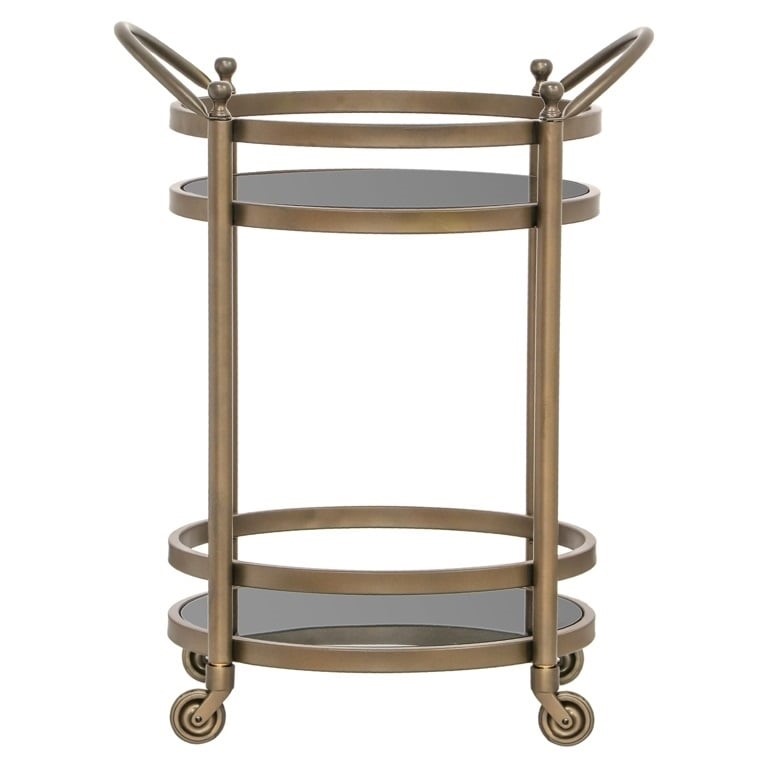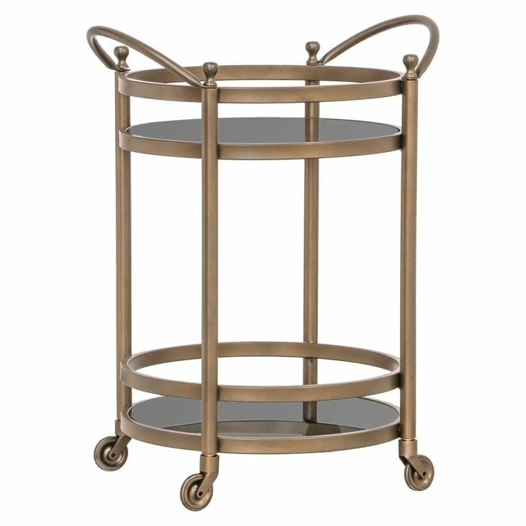 Barek Hendricks to elegancki mebel na kółkach, który łączy w sobie nowoczesny design i praktyczność. Wykonany z aluminium, metalu oraz szkła, zachwyca matową mosiężną podstawą i ciemnoszklanym blatem, który dodaje mu wyjątkowego charakteru. Dzięki dwóm wbudowanym półkom, barek staje się funkcjonalnym elementem wystroju, idealnym do przechowywania napojów, dekoracji czy czasopism. Wersja w złocie dostępna jako alternatywa, doskonale wpisuje się w najnowsze trendy wnętrz.