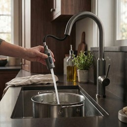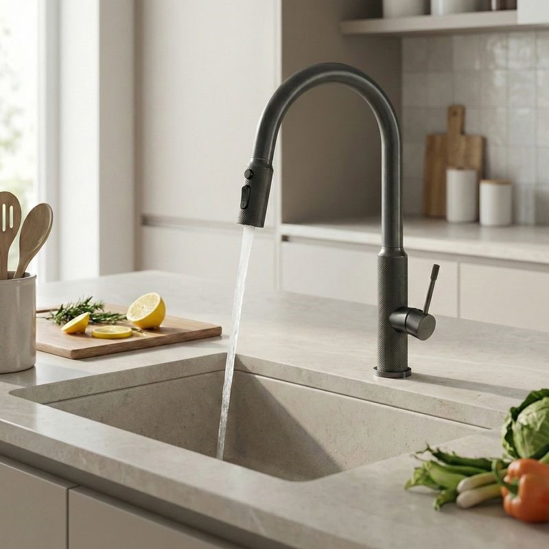 Bateria kuchenna MASTER to funkcjonalne i estetyczne rozwiązanie do każdej kuchni. Jej nowoczesny design sprawia, że doskonale komponuje się zarówno z klasycznymi, jak i nowoczesnymi aranżacjami. Solidna konstrukcja oraz wysokiej jakości materiały zapewniają trwałość i odporność na intensywne użytkowanie. Ergonomiczny uchwyt umożliwia wygodną regulację temperatury i strumienia wody, co zwiększa komfort codziennych czynności kuchennych.