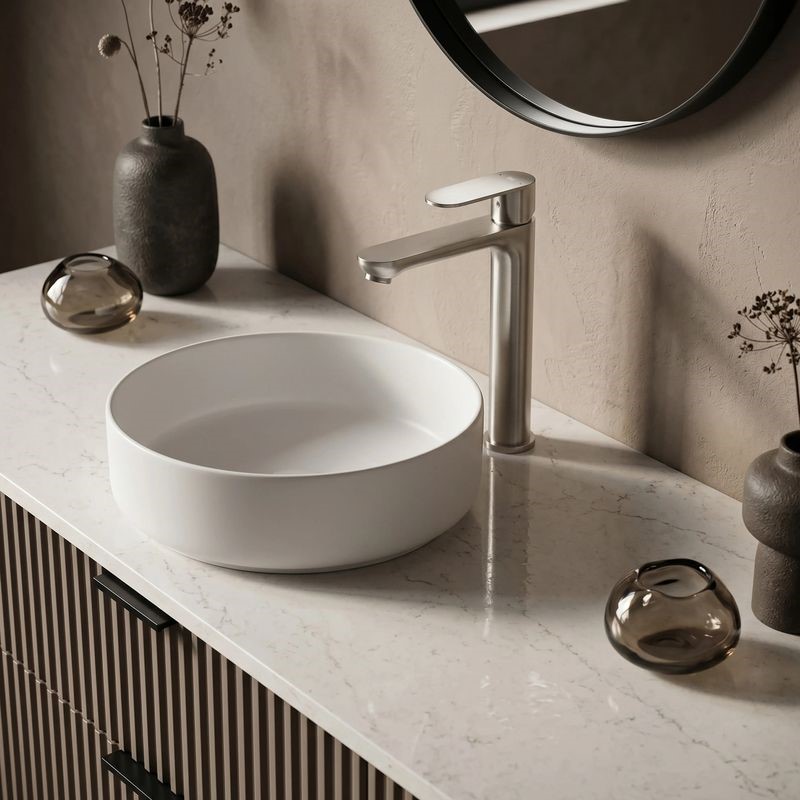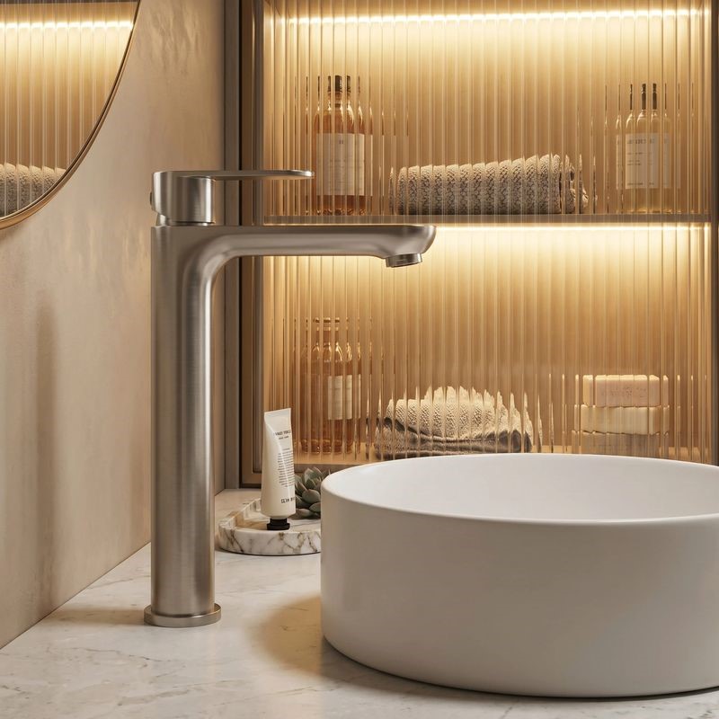 Bateria umywalkowa LOGAN w wersji wysokiej to idealne rozwiązanie do nowoczesnych łazienek z umywalkami nablatowymi. Smukła konstrukcja oraz eleganckie wykończenie podkreślają styl wnętrza. Wysoka forma zapewnia wygodę użytkowania oraz większą przestrzeń roboczą. Wykonana z trwałych materiałów, bateria jest odporna na wilgoć i codzienne użytkowanie.