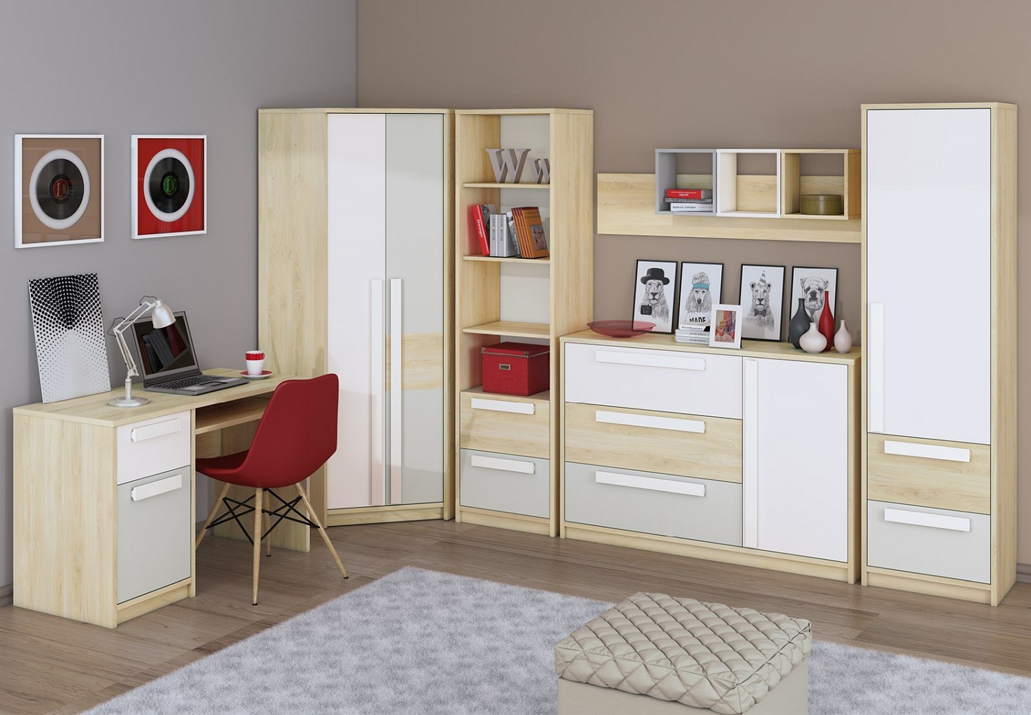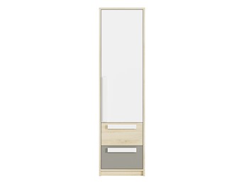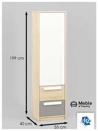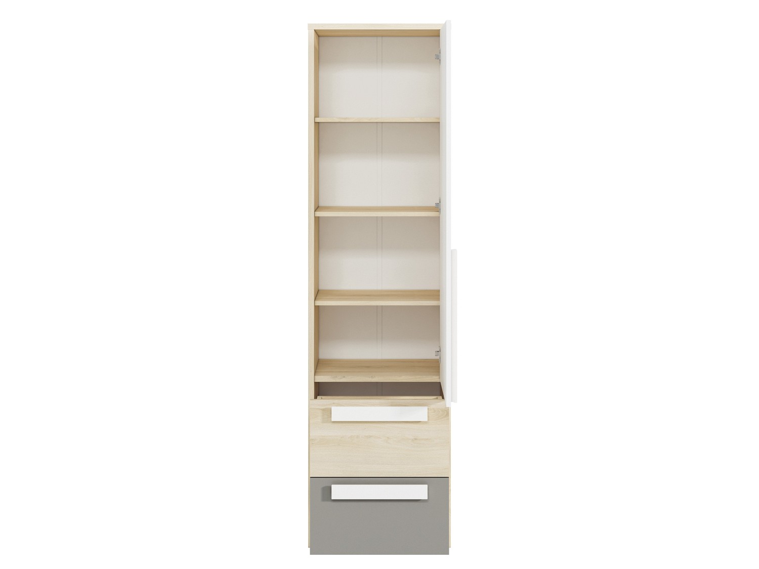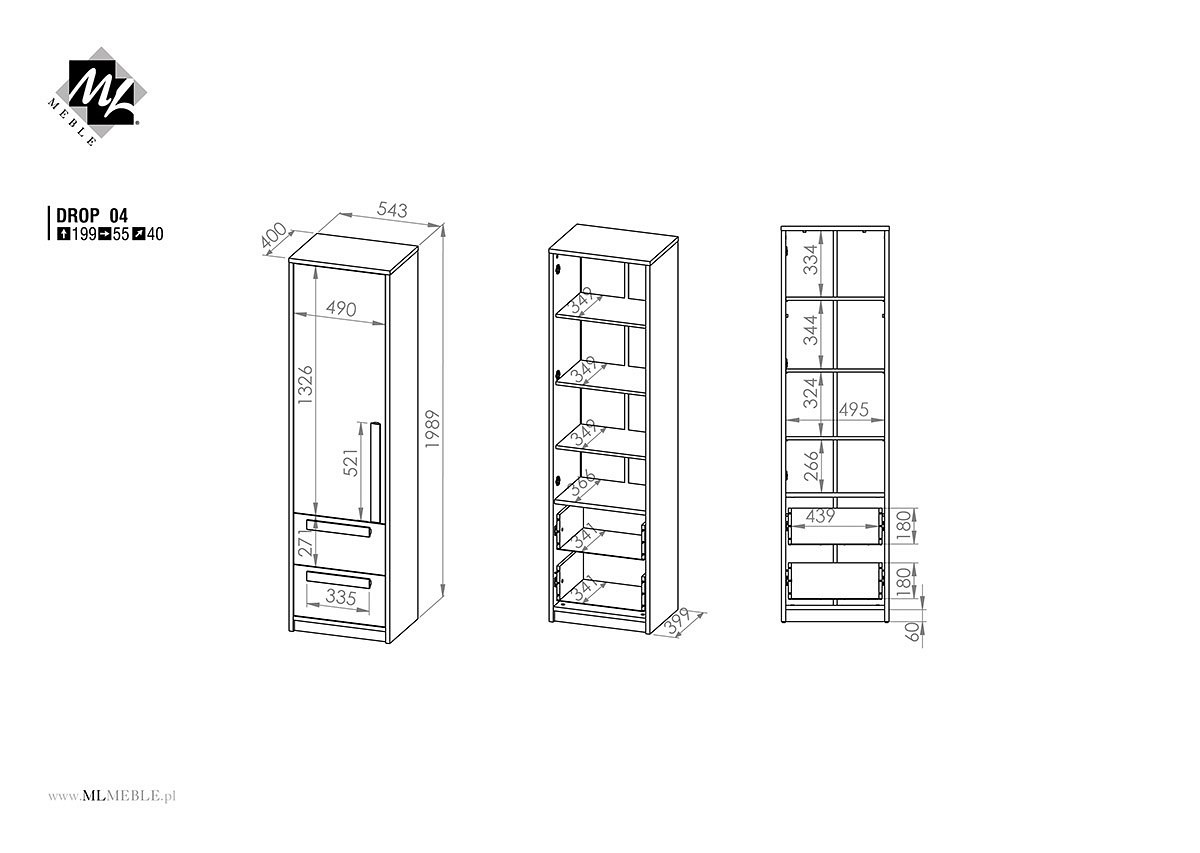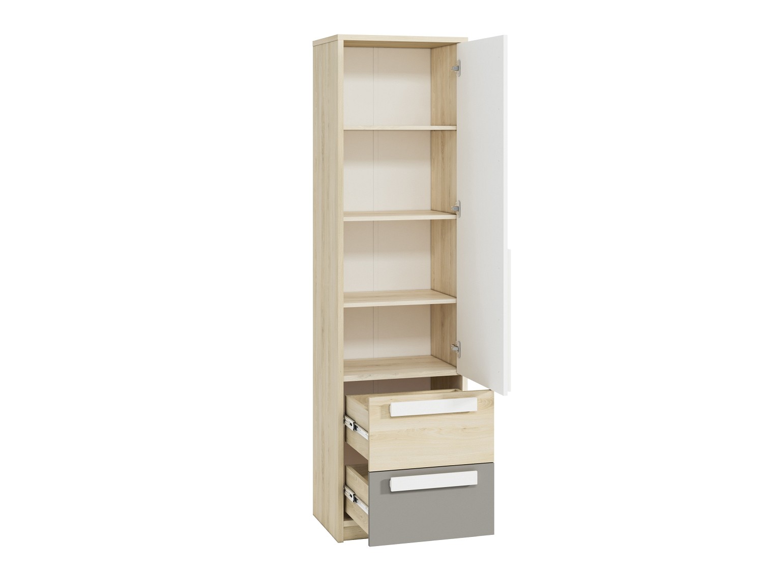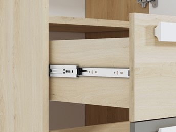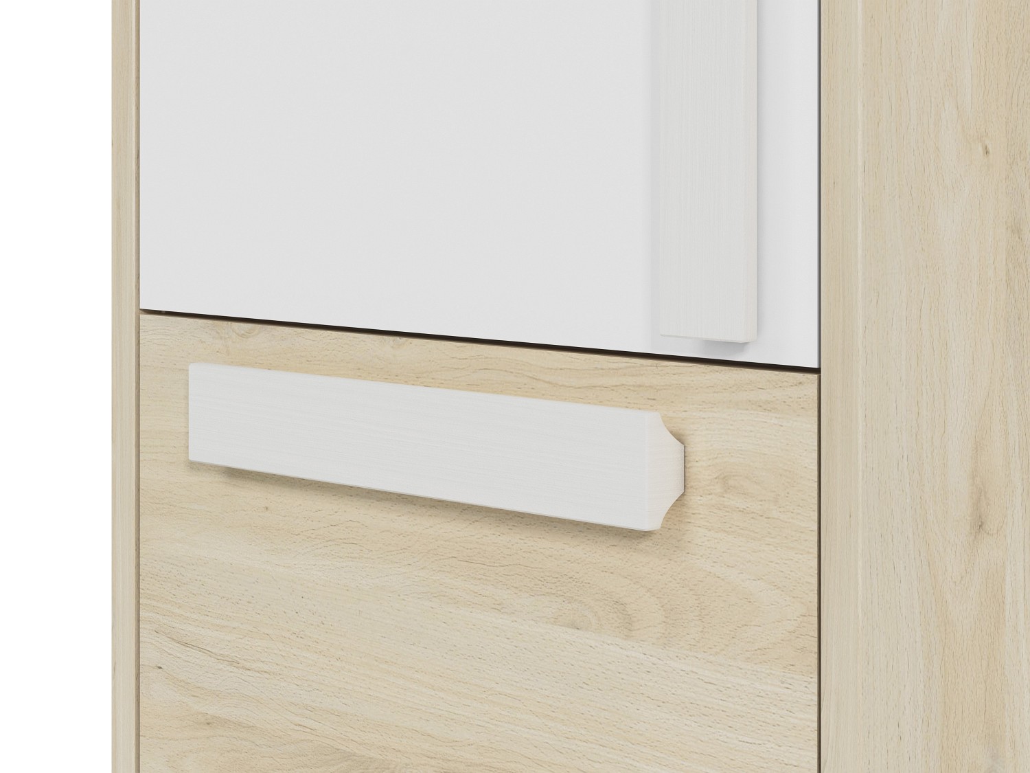 Drop 04 to bieliźniarka złożona z zestawu pojemnych półek pozwalających na prostą organizację garderoby. Wykonano ją z odpornej na wysoką temperaturę, wilgoć i zarysowania płyty laminowanej w kolorze buk fjord. O jeszcze większą trwałość Drop 04 dbają obrzeża ABS przeciwdziałające zniszczeniom spowodowanym przez uderzenia. Natomiast wyjątkową stylistykę mebla gwarantuje biały front drzwi wyposażony w duże, geometryczne uchwyty.