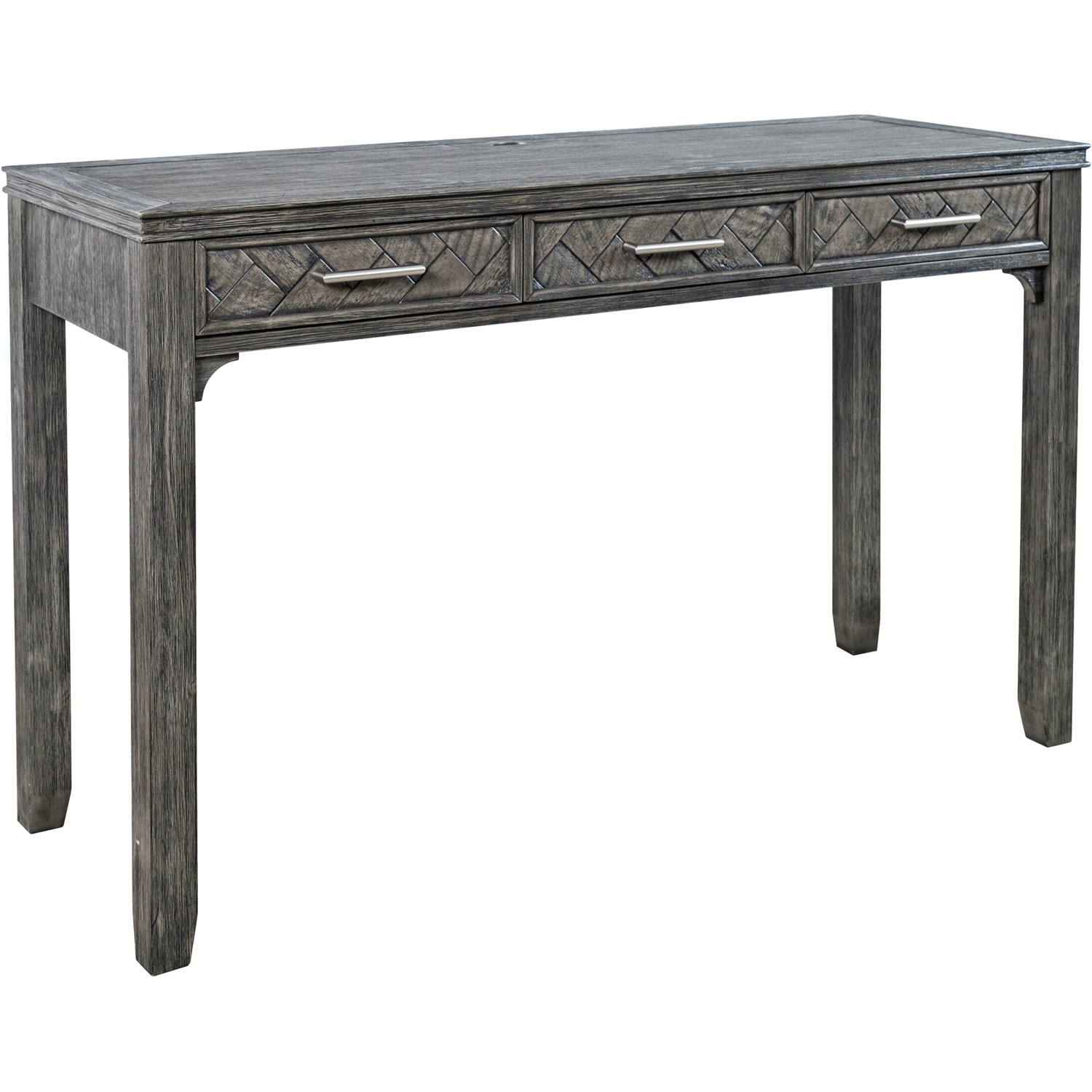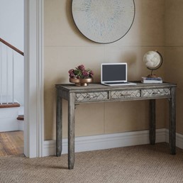 Tradycyjne biurko o szerokości 122 cm w eleganckim kolorze szaro-brązowym, nadającym mu ciepły i przyjemny wygląd. Wykonane z trwałego drewna akacji, biurko zachwyca inkrustowanymi detalami, dodającymi mu wyrafinowanego charakteru.