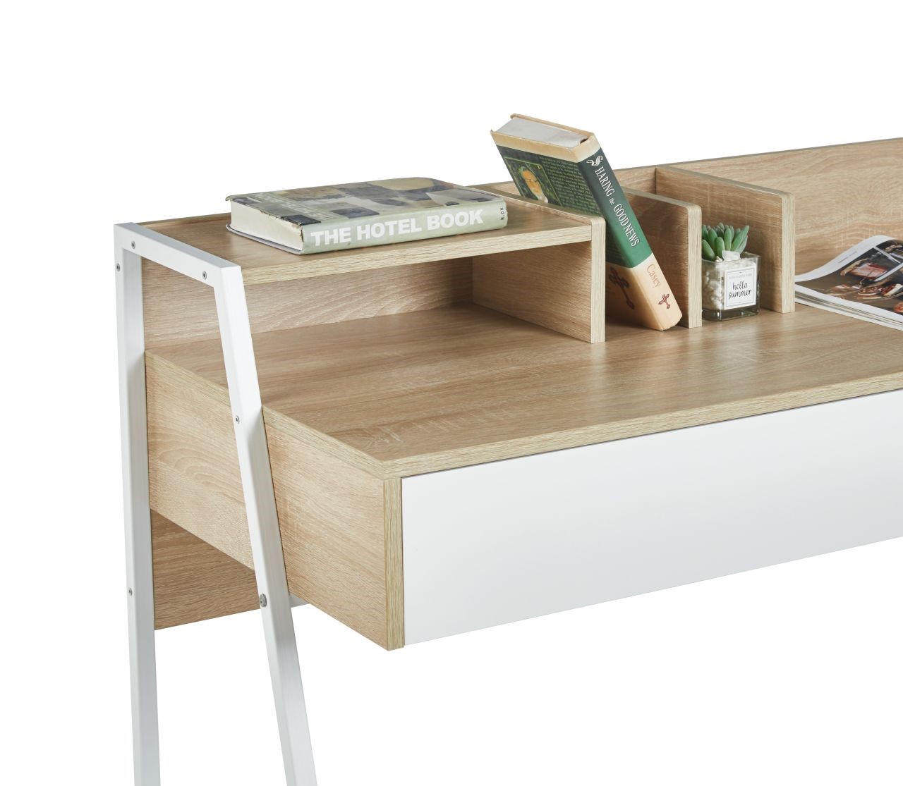 Prezentowane biurko to stylowe i funkcjonalne rozwiązanie, które doskonale sprawdzi się zarówno w nowoczesnym, jak i klasycznym wnętrzu. Wykonane z wysokiej jakości materiałów, biurko łączy minimalistyczny design z praktycznymi rozwiązaniami, zapewniając komfort pracy i organizacji przestrzeni. Solidna konstrukcja opiera się na metalowych nogach, które nadają mu stabilność, a przestronny blat zapewnia wystarczającą ilość miejsca na komputer, dokumenty i inne niezbędne akcesoria. Jego nowoczesny wygląd i funkcjonalność sprawiają, że jest to doskonały wybór dla osób ceniących sobie prostotę i elegancję.