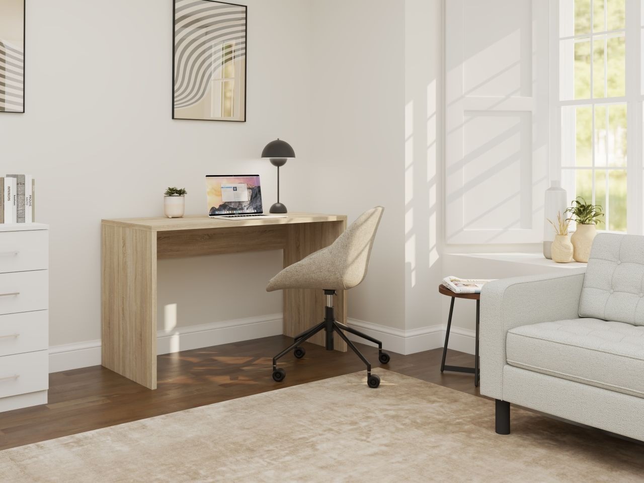 Prezentowane biurko to stylowe i funkcjonalne rozwiązanie, które doskonale sprawdzi się zarówno w nowoczesnym, jak i klasycznym wnętrzu. Wykonane z wysokiej jakości materiałów, biurko łączy minimalistyczny design z praktycznymi rozwiązaniami, zapewniając komfort pracy i organizacji przestrzeni. Solidna konstrukcja opiera się na metalowych nogach, które nadają mu stabilność, a przestronny blat zapewnia wystarczającą ilość miejsca na komputer, dokumenty i inne niezbędne akcesoria. Jego nowoczesny wygląd i funkcjonalność sprawiają, że jest to doskonały wybór dla osób ceniących sobie prostotę i elegancję.