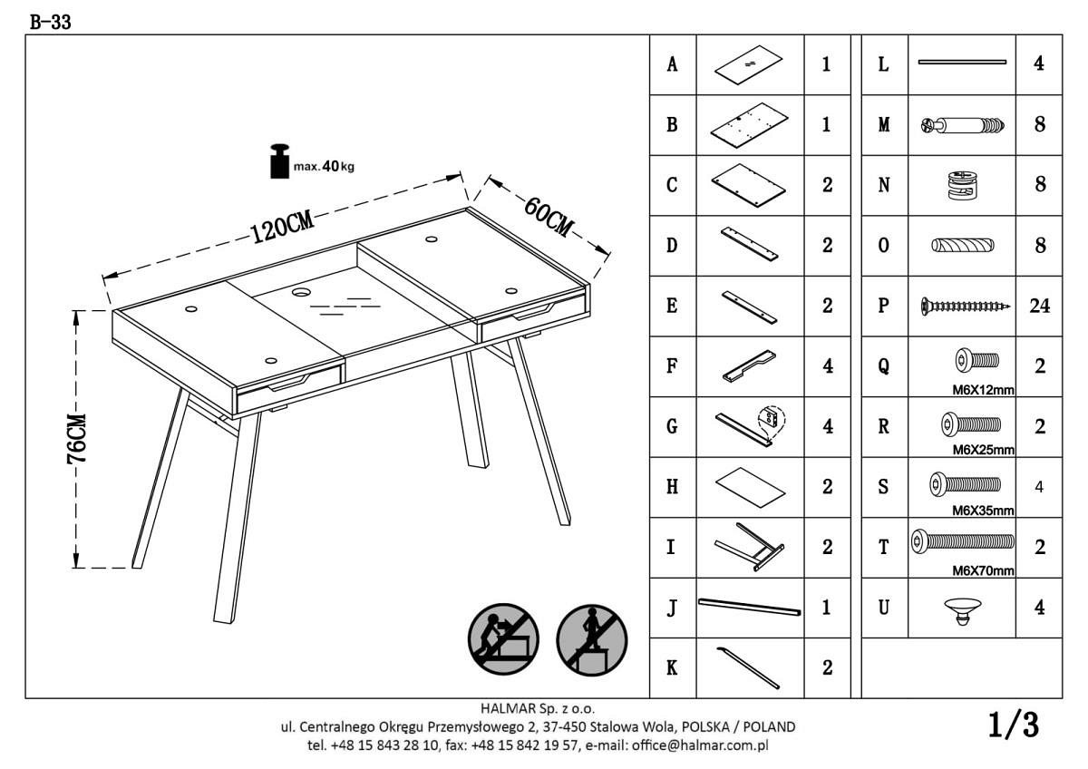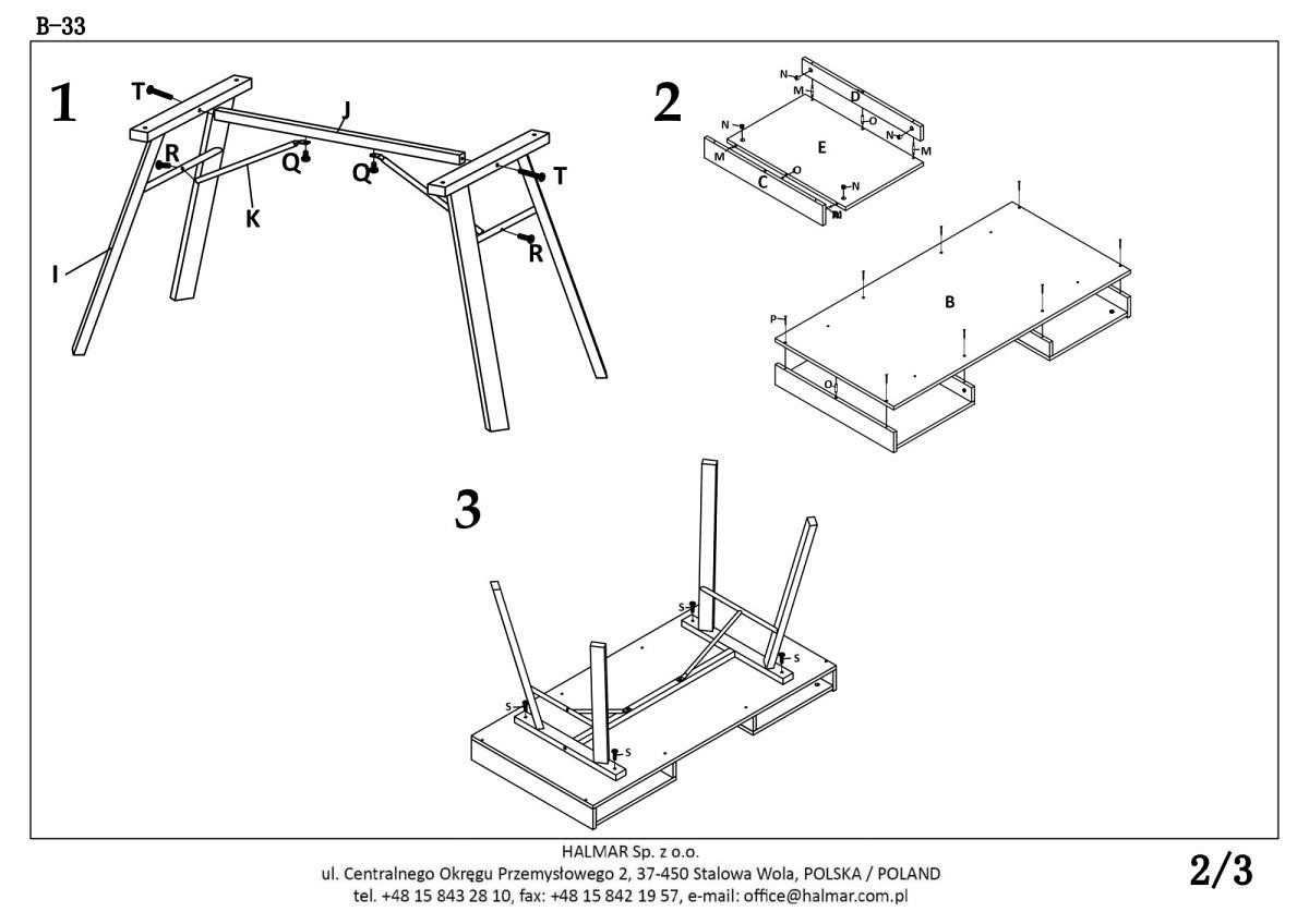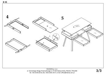 B-33 to designerska propozycja biurka domowego. Blat wykonany został z laminowanej płyty MDF posiadającej dwie szuflady i jedną półkę pomiędzy. Od góry nałożono szkło hartowane. Nogi stołu wykonane ze stali malowanej proszkowo, które nachylone są do centralnej części pod kątem 70 stopni.