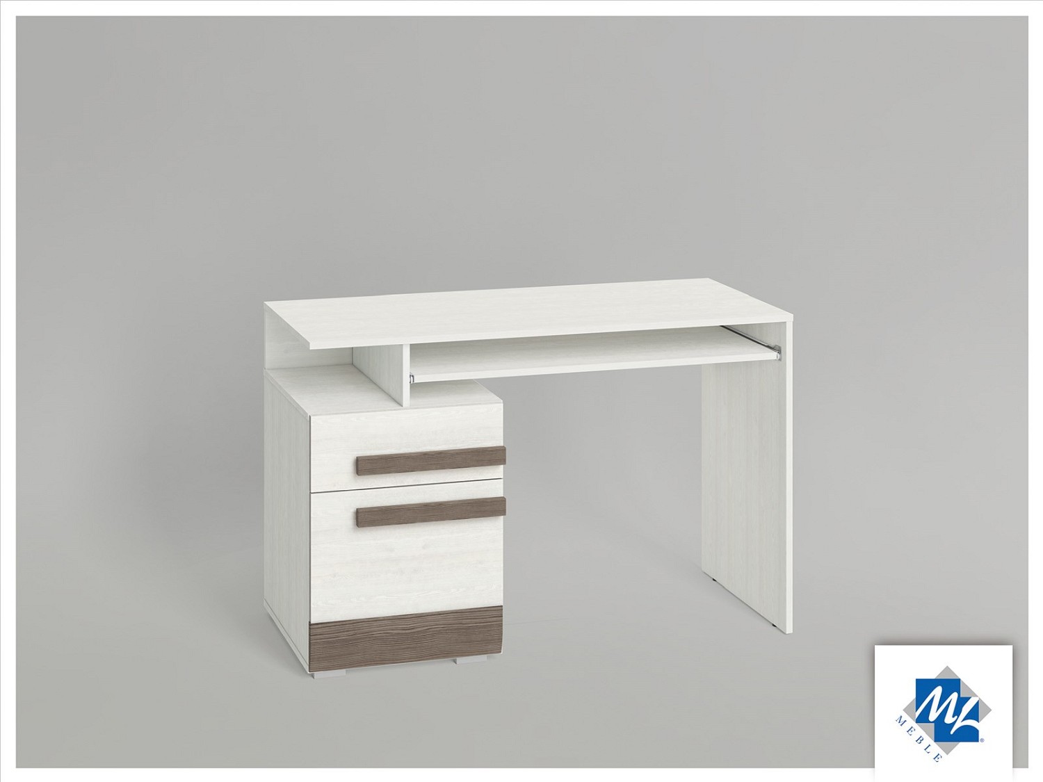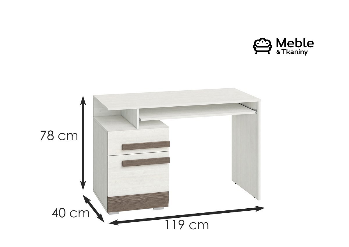 Warto wyrażać swoją indywidualność. Nawet przy wyborze mebli. Dla tych, którzy cenią sobie nowoczesność i niebanalne połączenia kolorystyczne stworzono biurko BLANCO 11. To klasyczny blat, wysuwana półka oraz dwie szuflady z odpornej na wilgoć i trwałej płyty MDF w kolorze new grey. Przełamano je elementami w kolorze ciemnej sosny śnieżnej, z której wykonano m.in. uchwyty.