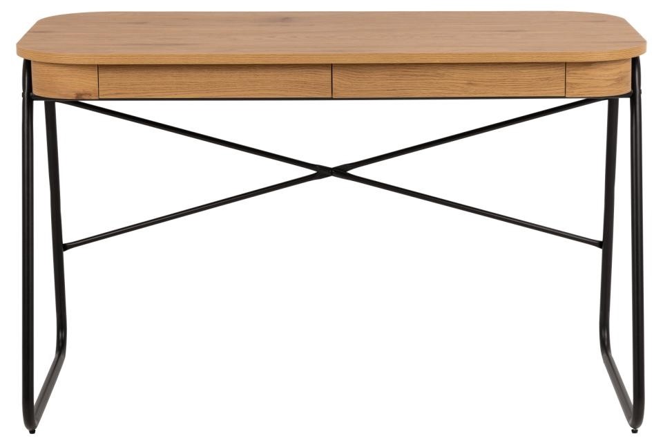 Biurko BLUETON w kolorze czarnym i dębu to połączenie elegancji i funkcjonalności, które znajdzie swoje miejsce w każdym nowoczesnym domowym biurze. Jego prostokątny blat wykonany jest z płyty MDF, pokrytej okleiną imitującą dąb, co zapewnia trwałość i estetyczny wygląd. Zaokrąglone rogi blatu dodają miękkości wizualnej, a kontrastująca czarna stalowa rama nadaje mu nowoczesny charakter.