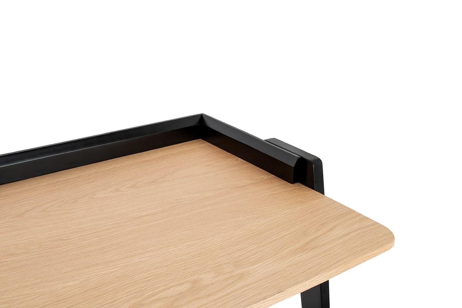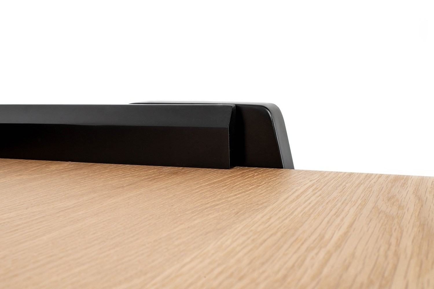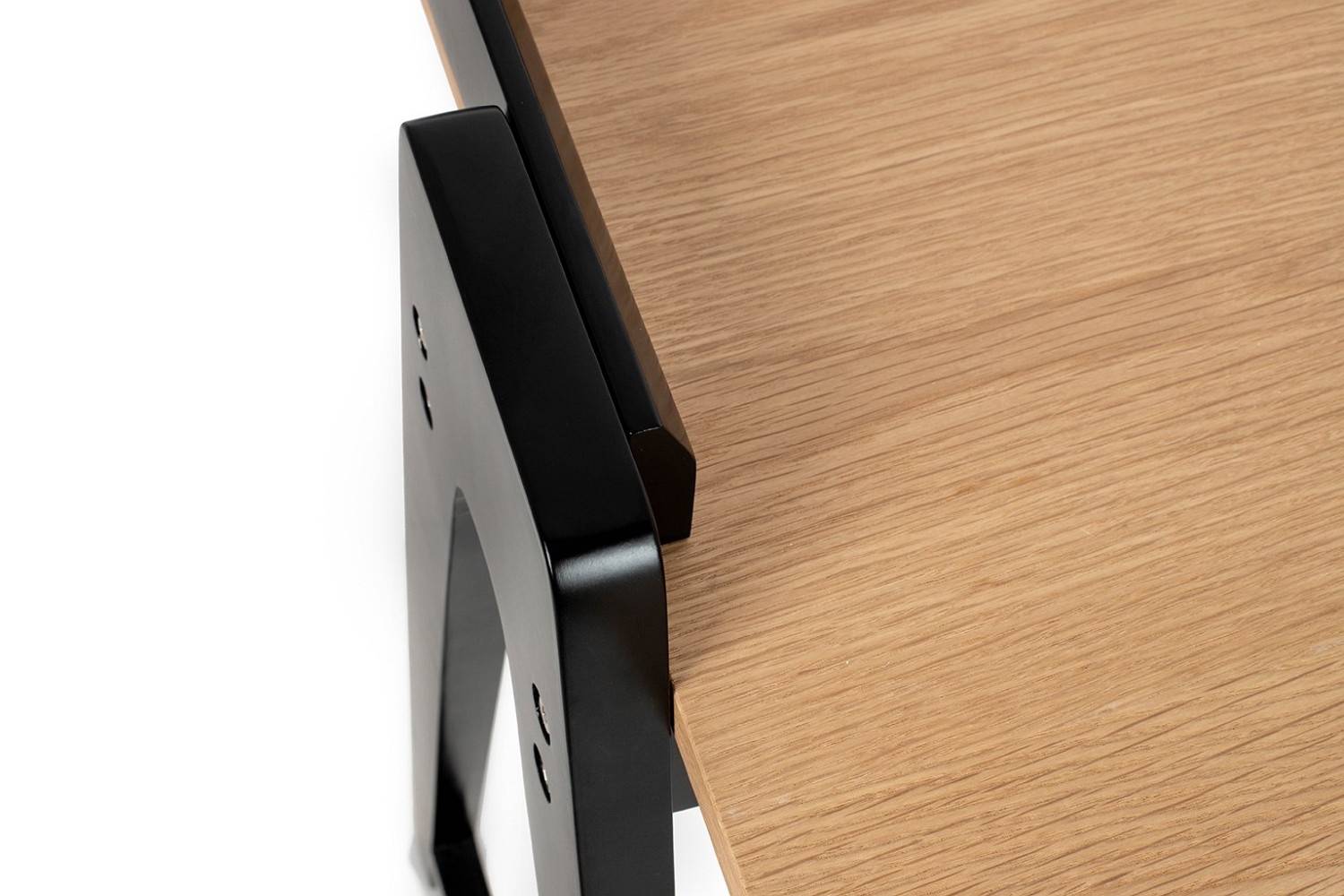 Blat biurka wykonany został z płyty meblowej w okleinie dębowej, natomiast nogi biurka wykonane są z drewna bukowego malowanego na kolor czarny.