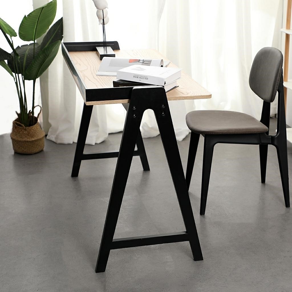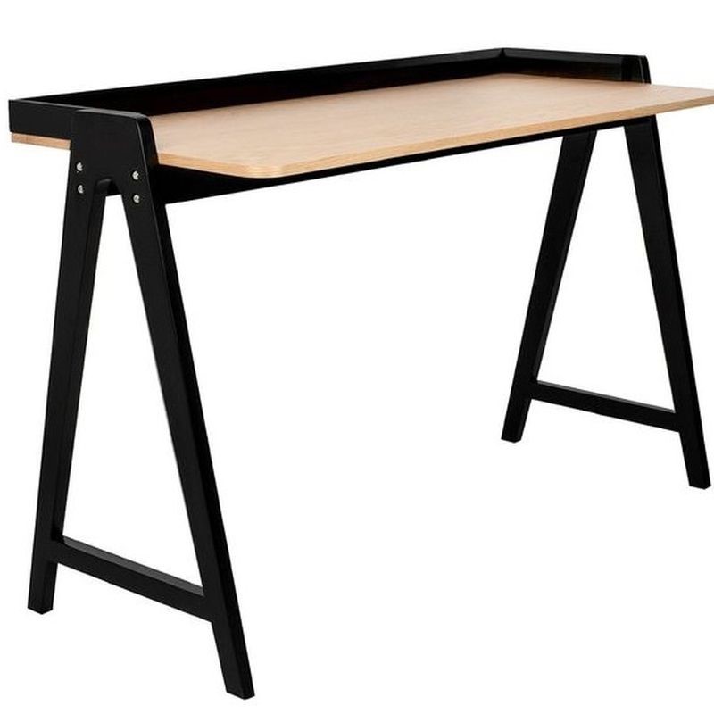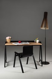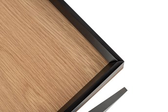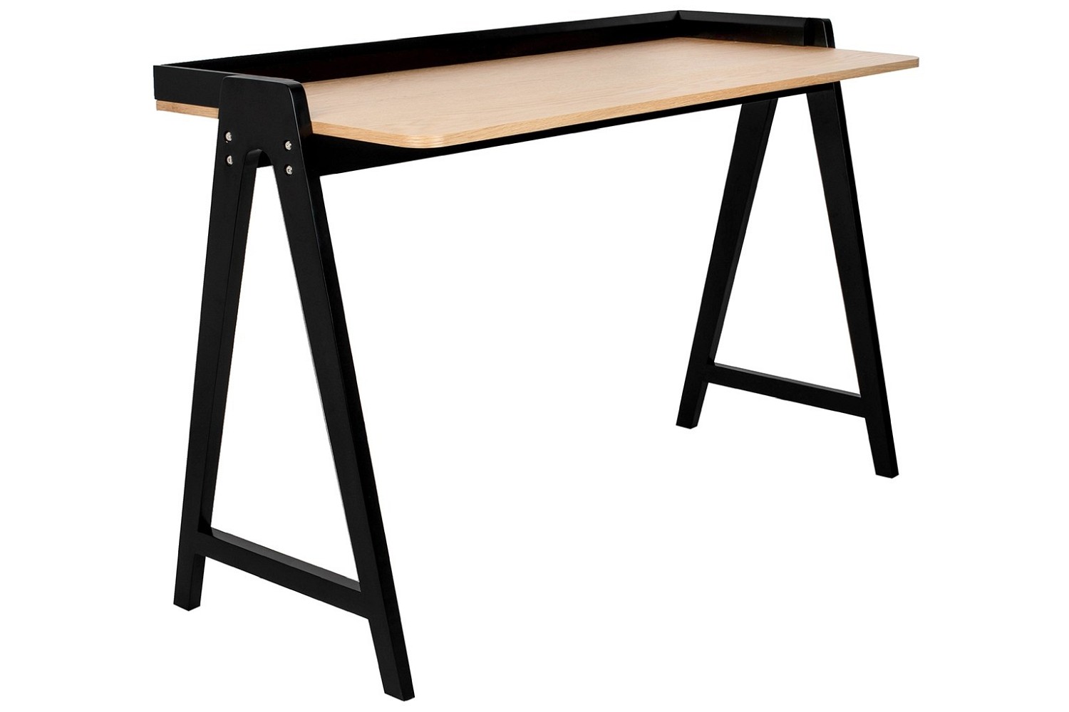 Blat biurka wykonany został z płyty meblowej w okleinie dębowej, natomiast nogi biurka wykonane są z drewna bukowego malowanego na kolor czarny.