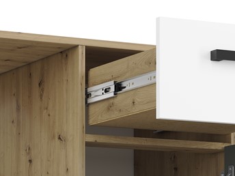 Biurko Fini 08 łączy w sobie elegancję dębu artisan z nowoczesnością białego wykończenia i antracytowym akcentem, co czyni je doskonałym wyborem do każdego wnętrza. Jego funkcjonalność i estetyka sprzyjają komfortowej pracy oraz kreatywnemu myśleniu.