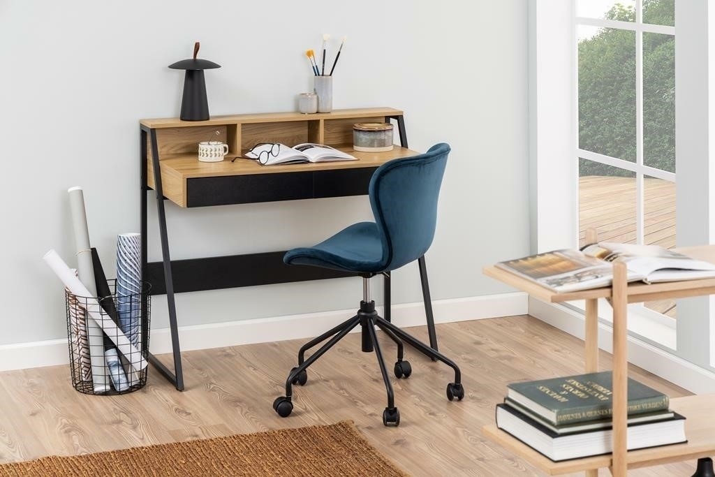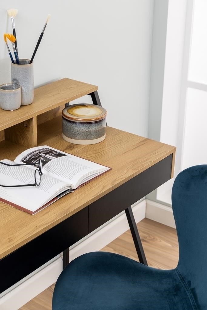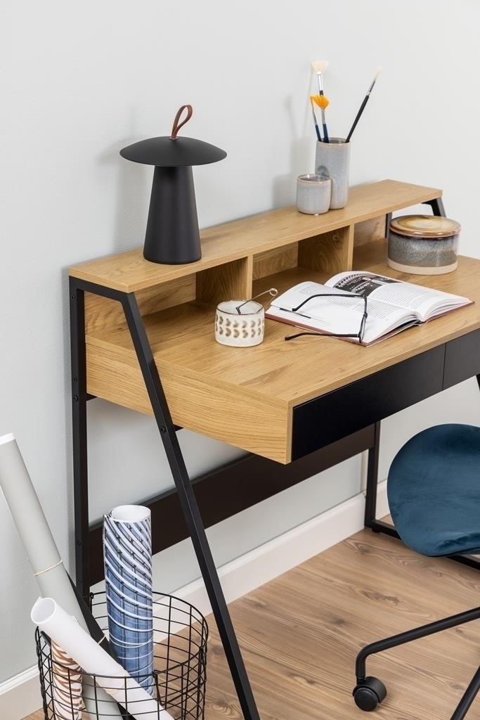 Biurko Reece to mebel, który doskonale wpisuje się w nowoczesne, industrialne oraz skandynawskie wnętrza. Jego solidna konstrukcja, z metalową podstawą i blatem imitującym dąb, gwarantuje trwałość i stabilność. Z dodatkowymi funkcjami, takimi jak nadstawka, szuflady i otwór na kable, biurko zapewnia wygodną przestrzeń do pracy i organizacji.