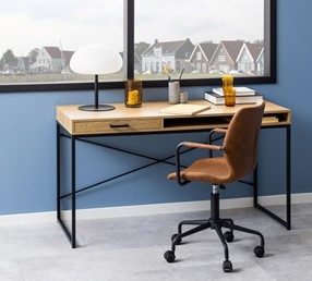 Dodatkowym elementem dekoracyjnym są krzyżujące się metalowe elementy z tyłu biurka, które podkreślają jego unikalny styl. Biurko Seaford jest nie tylko funkcjonalne, ale również stanowi atrakcyjny element aranżacji, pasujący zarówno do wnętrz industrialnych, jak i skandynawskich.