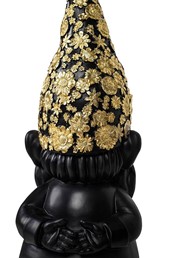 Nieco różniący się od tych już znanych, tradycyjnych krasnali ogrodowych: wyróżniający się złotą czapką w kwiatki i czarnym, eleganckim połyskującym wykończeniem. Bajkową, przyjazną figurę wykonano z żywicy.