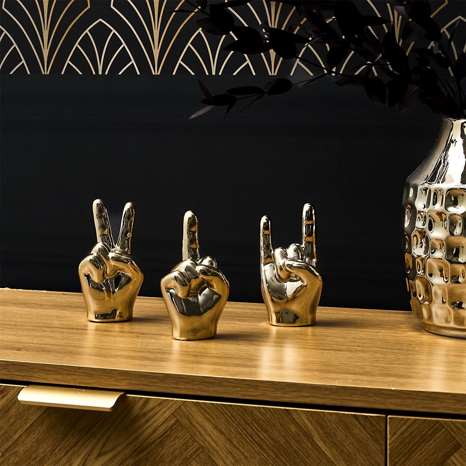 Dekoracyjna figurka w kształcie dłoni to oryginalny element wystroju, który przyciąga wzrok i nadaje wnętrzu charakteru. Złote wykończenie podkreśla jej elegancki i nowoczesny styl, doskonale pasujący do salonu, sypialni lub gabinetu. Starannie wykonana forma sprawia, że dekoracja prezentuje się efektownie zarówno samodzielnie, jak i w zestawieniu z innymi dodatkami. To detal, który podkreśla indywidualny styl aranżacji.