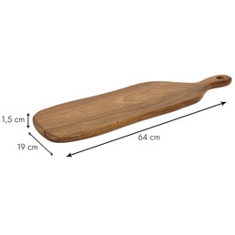 Deska do krojenia drewniana o długości 64 cm to praktyczny i stylowy dodatek do każdej kuchni. Wykonana z wysokiej jakości drewna, zapewnia trwałość i estetyczny wygląd. Jej duża powierzchnia robocza jest idealna do krojenia warzyw, owoców, mięsa i chleba. Naturalne drewno jest nie tylko trwałe, ale także dodaje ciepła i elegancji do wnętrza kuchni. Deska ma wygodny uchwyt, który ułatwia jej przenoszenie i użytkowanie. Dzięki swojej solidnej konstrukcji, jest odporna na zarysowania i uszkodzenia. To niezbędny element każdej dobrze wyposażonej kuchni.
