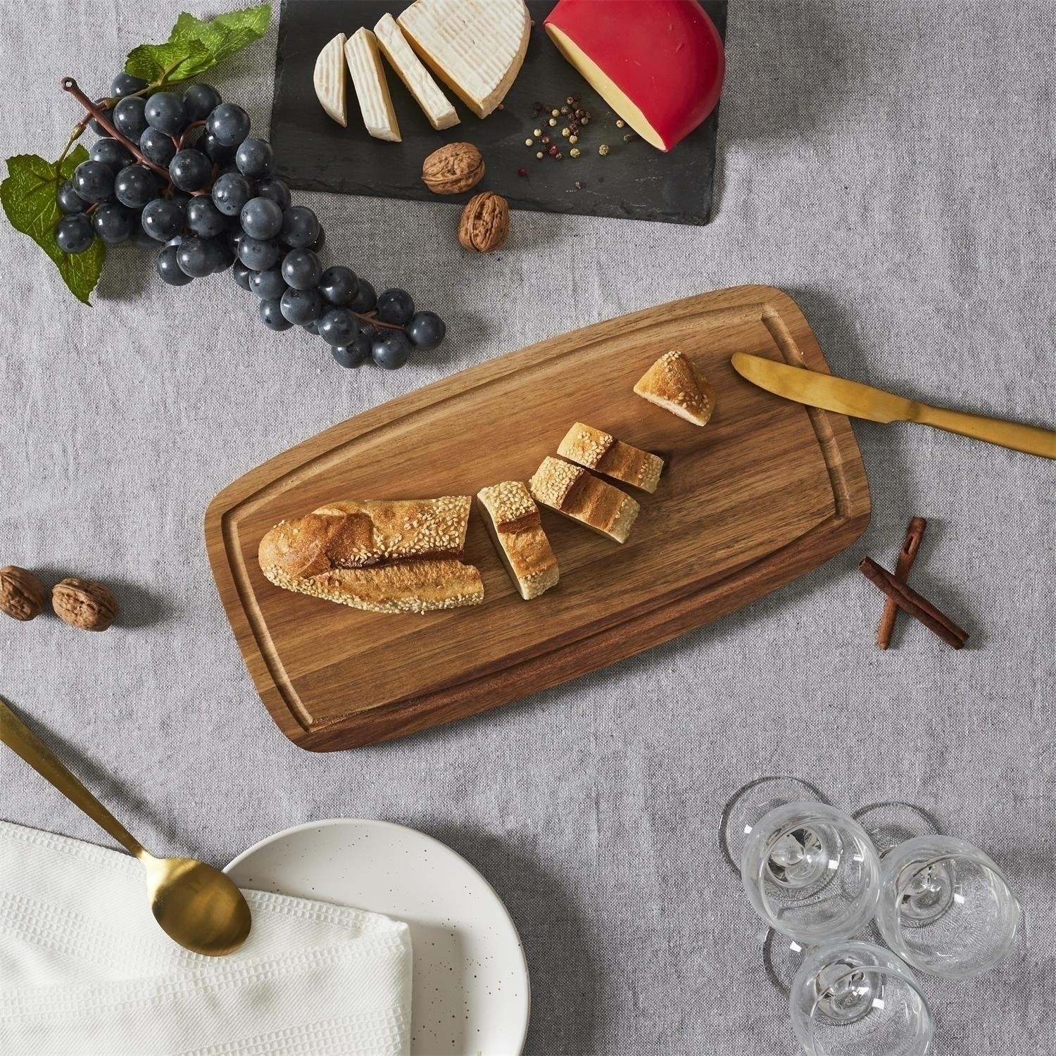 Deska do krojenia z drewna akacjowego to nie tylko praktyczne, ale też stylowe wyposażenie kuchni. Jej struktura i kolor podkreślają naturalne piękno drewna, a specjalne rowki sprawiają, że krojenie chleba czy bułek staje się czystsze. Trwała i łatwa do utrzymania w czystości.