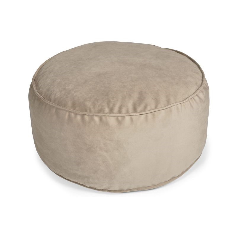 Okrągły puf wykonany z miękkiego aksamitu to idealne dodatkowe siedzisko do niskich ławek. Poduszka może być również stosowana w pokojach rozwojowych, salach zabaw i pokojach dziecięcych. Miękkie wypełnienie poduszki jest bardzo elastyczne, gąbka zawsze wraca do swojego kształtu, a powierzchnia nie odkształca się. Zewnętrzny materiał to beżowy aksamit, łatwy w czyszczeniu i przyjemny w dotyku. Spód pufy wykonany z tkaniny przypominającej płótno w kolorze szarym. Dolny i górny szew poduszki posiada element ozdobny w postaci lamówek, dzięki czemu wygląda elegancko i oryginalnie.