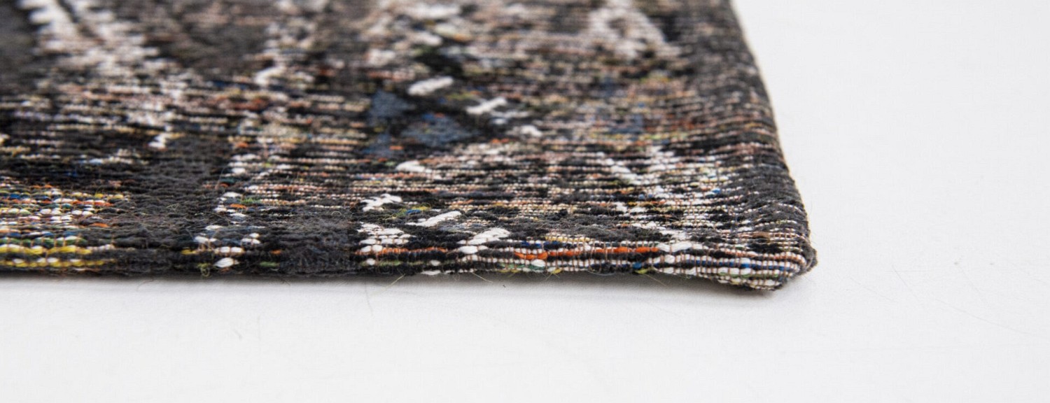 Czarny dywan kilim - BLACK SALE 9113, prestiżowa belgijska marka Louis De Poortere, z kolekcji Antiquarian. Wykonany jest z 85% bawełny szenilowej (z dodatkiem 15% wełny), co sprawia, że dywan jest przyjemny w dotyku, poprawia akustykę pomieszczenia, a jego oddychająca struktura utrzymuje ciepło, nie dopuszczając do kurzu i chemikaliów oczyszczając w ten sposób powietrze . Twój oddech Płaski splot z gęstym splotem żakardowym pozwala uzyskać bardzo szczegółowy i szczegółowy wzór, zapewniając jednocześnie wytrzymałość i, bardziej niż grube dywany, odporność na wypaczanie się pod ciężarem mebli. Ponadto dywan jest łatwy w utrzymaniu czystości dzięki niskiemu włosiu, które łatwo się odkurza. Dzięki gumowej powłoce na spodzie maty mata jest stabilna i nie przesuwa się. Materiał Mat charakteryzuje się niską palnością, a jednocześnie wysoką przewodnością cieplną (certyfikat), dzięki czemu doskonale sprawdza się zarówno w pomieszczeniach kominkowych, jak i ogrzewaniu podłogowym.