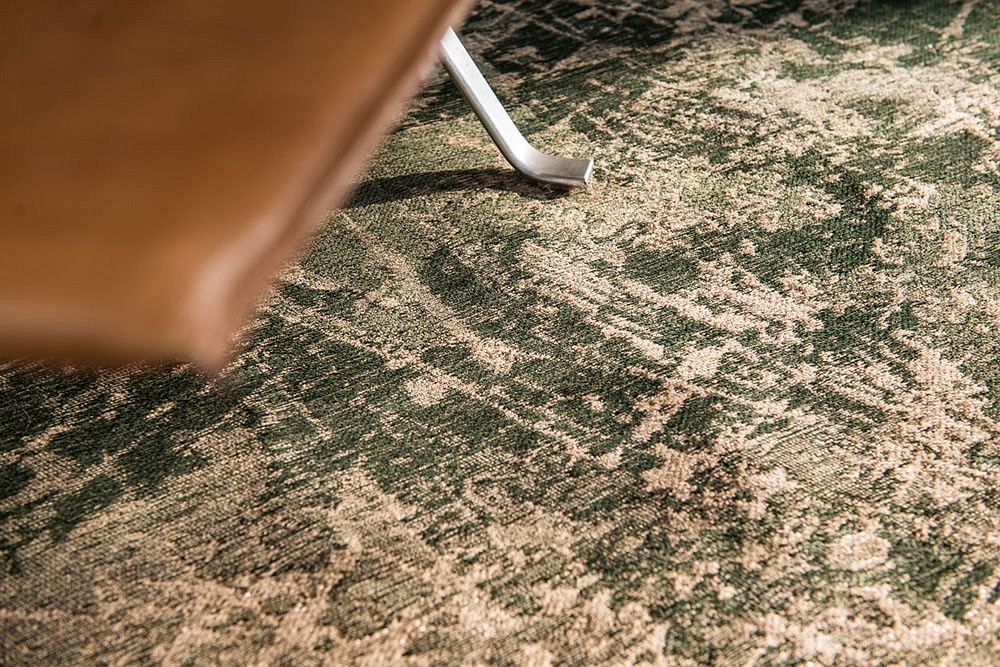 Współczesny zielony dywan DARK PINE 8723, prestiżowej belgijskiej marki Louis De Poortere, z kolekcji Mad Men Cracks . Wykonany jest z 85% bawełny szenilowej (z dodatkiem 15% błyszczącego poliestru dla efektywnego połysku), dzięki czemu dywan jest przyjemny w dotyku, poprawia akustykę pomieszczenia, a jego oddychająca struktura zatrzymuje ciepło wewnątrz, usuwając kurz i chemikalia , oczyszczając powietrze. you breath Płaskie tkanie z gęsto szytym splotem żakardowym pozwala uzyskać bardzo szczegółowy i szczegółowy wzór, zapewniając jednocześnie wytrzymałość i, bardziej niż grube dywany, odporność na odkształcenia pod ciężarem mebli. Ponadto dywan jest łatwy w utrzymaniu czystości dzięki niskiemu włosiu, które łatwo się odkurza. Dzięki gumowej powłoce na spodzie maty mata jest stabilna i nie przesuwa się. Materiał Mat charakteryzuje się niską palnością, a jednocześnie wysoką przewodnością cieplną (certyfikat), dzięki czemu doskonale sprawdza się zarówno w pomieszczeniach kominkowych, jak i ogrzewaniu podłogowym.