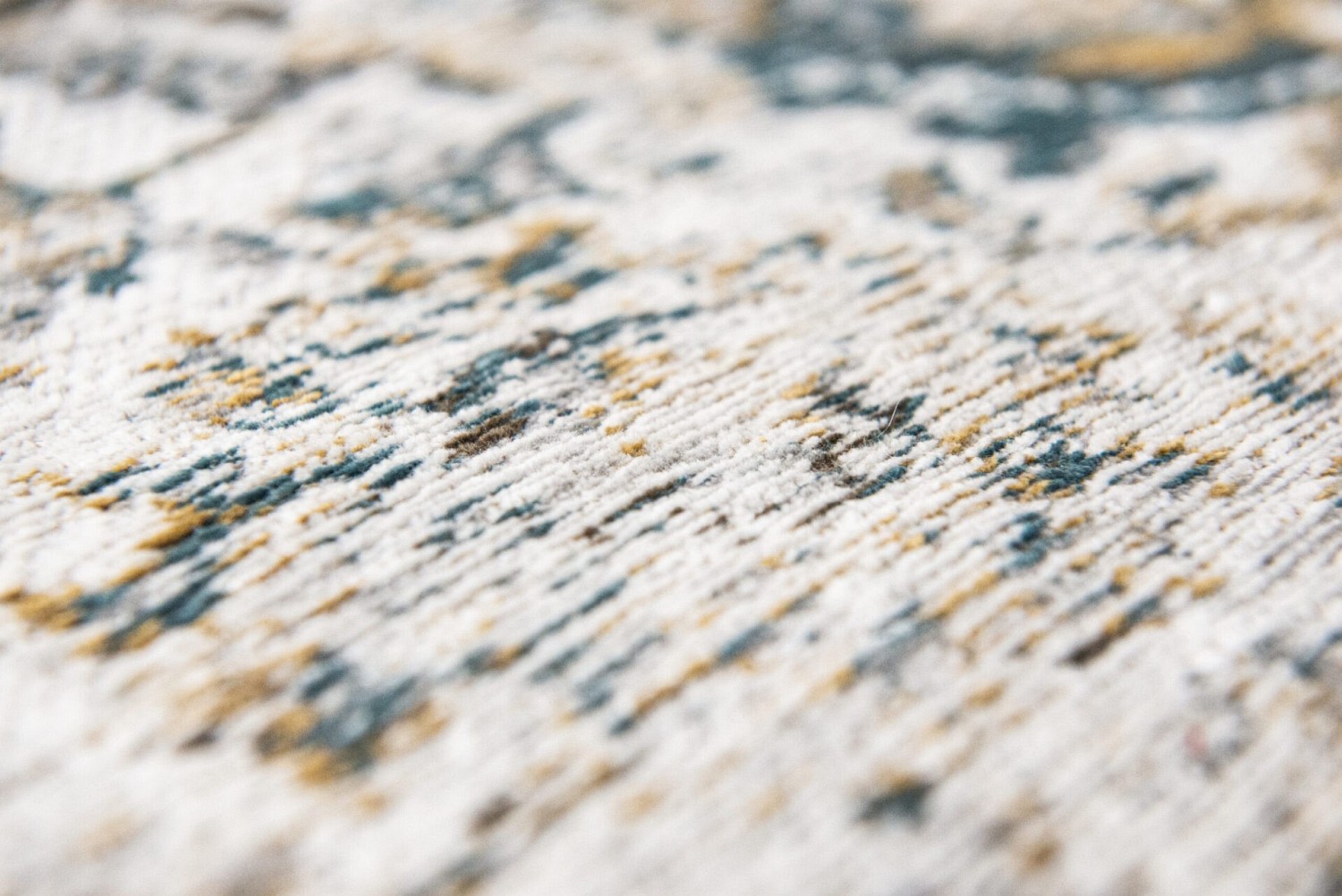 Kolorowy dywan vintage - FENER 9127, Antykwariusz Bakthiari od prestiżowej belgijskiej marki Louis De Poortere. Wykonany jest w 100% z bawełny szenilowej, co sprawia, że dywan jest przyjemny w dotyku, poprawia akustykę pomieszczenia, a jego oddychająca struktura zatrzymuje ciepło, jednocześnie zatrzymując kurz i chemikalia, oczyszczając w ten sposób powietrze, którym oddychamy. Tkanie na płasko z gęstym splotem żakardowym pozwala uzyskać bardzo szczegółowy i szczegółowy wzór, zapewniając jednocześnie wytrzymałość i, bardziej niż grube dywany, odporność na odkształcenia pod ciężarem mebli. Ponadto dywan jest łatwy w utrzymaniu czystości dzięki niskiemu włosiu, które łatwo się odkurza. Dzięki gumowej powłoce na spodzie maty mata jest stabilna i nie przesuwa się. Materiał Mat charakteryzuje się niską palnością a jednocześnie wysoką przewodnością cieplną (certyfikat), dzięki czemu doskonale sprawdza się zarówno w pomieszczeniach kominkowych jak i ogrzewaniu podłogowym.
