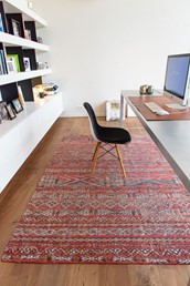 Czerwony dywan kilimowy - FEZ RED 9115 Antique od prestiżowej belgijskiej marki Louis De Poortere. Wykonany z 85% bawełny szenilowej (z dodatkiem 15% wełny), co sprawia, że ​​dywan jest przyjemny w dotyku, poprawia akustykę pomieszczenia, a jego oddychająca struktura utrzymuje ciepło, nie dopuszczając do kurzu i chemikaliów oczyszczając w ten sposób powietrze . Twój oddech Tkanie na płasko z gęstym splotem żakardowym pozwala uzyskać bardzo szczegółowy i szczegółowy wzór, zapewniając jednocześnie wytrzymałość i, bardziej niż grube dywany, odporność na odkształcenia pod ciężarem mebli. Ponadto dywan jest łatwy w utrzymaniu czystości dzięki niskiemu włosiu, które łatwo się odkurza. Dzięki gumowej powłoce na spodzie maty mata jest stabilna i nie przesuwa się. Materiał, z którego wykonana jest wykładzina ma niską palność, ale zachowuje wysoką przewodność cieplną (certyfikat), dzięki czemu doskonale sprawdza się zarówno w pomieszczeniach kominkowych, jak i ogrzewaniu podłogowym.