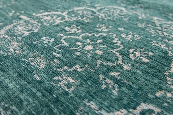 Zielony klasyczny dywan vintage - JADE 8258, prestiżowej belgijskiej marki Louis De Poortere, z kolekcji Fading World Medallion . Wykonany jest ze 100% bawełny szenilowej, dzięki czemu dywan jest przyjemny w dotyku, poprawia akustykę pomieszczenia. a jego oddychająca struktura utrzymuje ciepło, jednocześnie wiążąc kurz i chemikalia, oczyszczając w ten sposób powietrze, którym oddychasz. Płaski splot z gęstym splotem żakardowym pozwala uzyskać bardzo szczegółowy i szczegółowy wzór, zapewniając jednocześnie wytrzymałość i, bardziej niż grube dywany, odporność na wypaczanie się pod ciężarem mebli. Ponadto dywan jest łatwy w utrzymaniu czystości dzięki niskiemu włosiu, które łatwo się odkurza. Dzięki gumowej powłoce na spodzie maty mata jest stabilna i nie przesuwa się. Materiał Mat charakteryzuje się niską palnością, a jednocześnie wysoką przewodnością cieplną (certyfikat), dzięki czemu doskonale sprawdza się zarówno w pomieszczeniach kominkowych, jak i ogrzewaniu podłogowym.