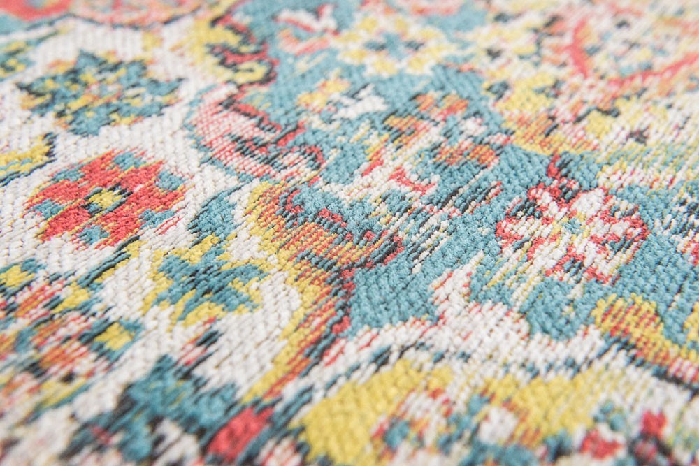 Kolorowy dywan vintage - JANISSERY 8712, prestiżowej belgijskiej marki Louis De Poortere, z kolekcji Antiquarian Bakthiari . Wykonany jest w 100% z bawełny szenilowej, co sprawia, że dywan jest przyjemny w dotyku, poprawia akustykę pomieszczenia oraz jego oddychającą strukturę. wychwytuje kurz i chemikalia, wychwytując ciepło, oczyszczając w ten sposób oddech. Tkanie na płasko z gęstym splotem żakardowym pozwala uzyskać bardzo szczegółowy i szczegółowy wzór, zapewniając jednocześnie wytrzymałość i, bardziej niż grube dywany, odporność na odkształcenia pod ciężarem mebli. Ponadto dywan jest łatwy w utrzymaniu czystości dzięki niskiemu włosiu, które łatwo się odkurza. Dzięki gumowej powłoce na spodzie maty mata jest stabilna i nie przesuwa się. Materiał Mat charakteryzuje się niską palnością a jednocześnie wysoką przewodnością cieplną (certyfikat), dzięki czemu doskonale sprawdza się zarówno w pomieszczeniach kominkowych jak i ogrzewaniu podłogowym.