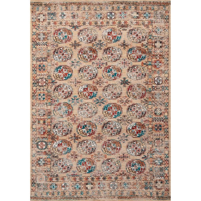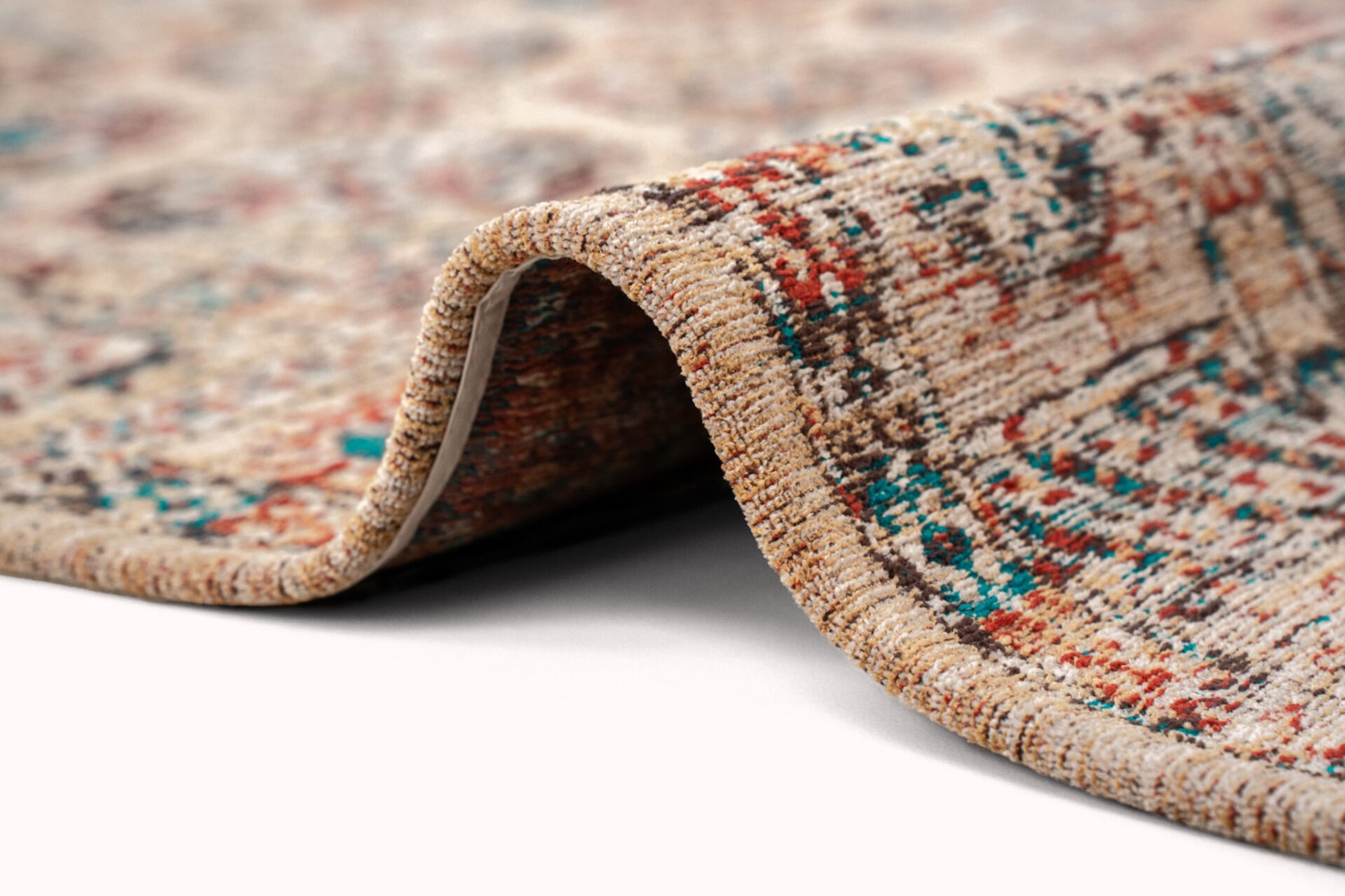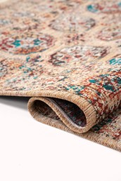 Dywan KASAK DJAMBOUL to wariacja na temat orientalnego wzoru, tym razem w łagodniejszym wydaniu kolorystycznym. Wzór został przetarty w sposób celowy, by uzyskać efekt vintage i sprawiać wrażenie rodzinnej pamiątki z historią. Jasne beże i akcenty czerwieni oraz niebieskiego tworzą spójną i elegancką całość. Idealny do wnętrz eklektycznych i klasycznych, szczególnie w połączeniu z drewnem i naturalnymi materiałami.
