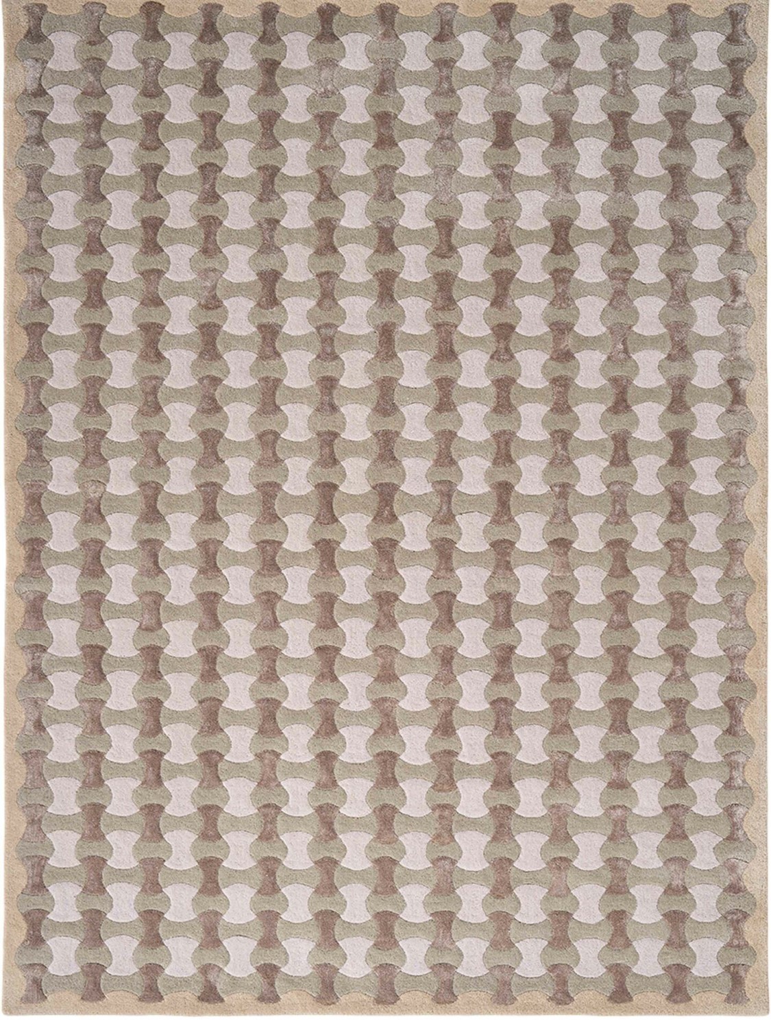 Beżowo-szaro-zielony dywan geometryczny marki Carpets & More to elegancki dodatek, który zachwyca nie tylko designem, ale i jakością wykonania. Stworzony z połączenia 80% wełny nowozelandzkiej i 20% wiskozy, oferuje wyjątkową trwałość i subtelny, jedwabisty połysk. Wełna naturalnie reguluje temperaturę oraz wilgotność powietrza, zapewniając komfort o każdej porze roku. Jego niezwykła miękkość sprawia, że chodzenie po nim boso to prawdziwa przyjemność. Geometryczny wzór i harmonijna kolorystyka beżu, szarości i zieleni doskonale komponują się z różnymi stylami wnętrzarskimi. Dywan jest odporny na zabrudzenia i posiada właściwości antyalergiczne, co ułatwia jego pielęgnację.