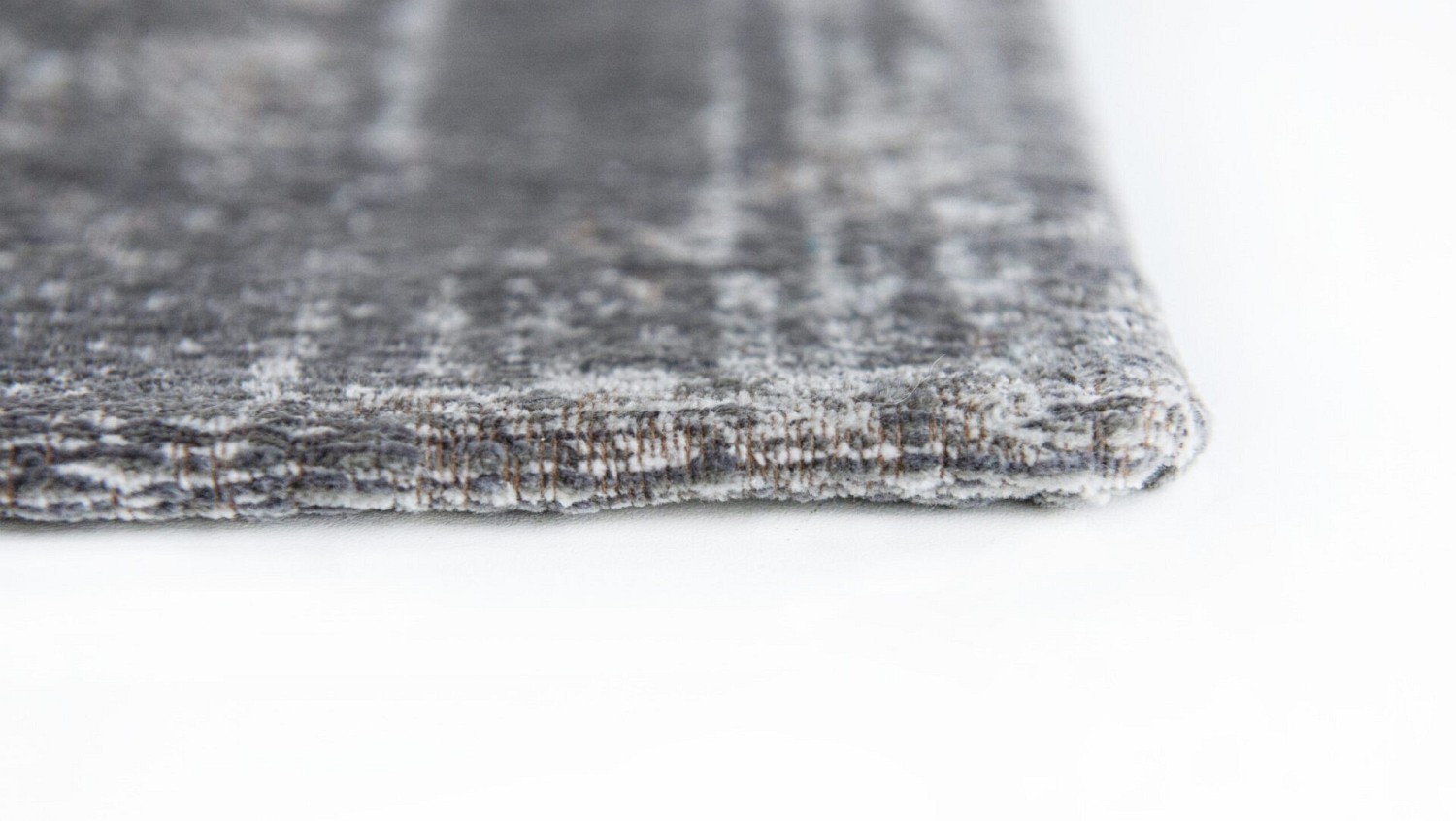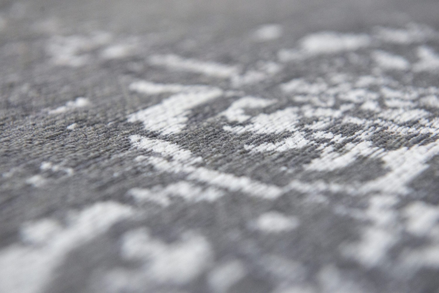 Szary klasyczny dywan - STONE 9148, prestiżowej belgijskiej marki Louis De Poortere, z kolekcji Fading World Medallion. Wykonany jest w 100% z bawełny szenilowej, co sprawia, że dywan jest przyjemny w dotyku, poprawia akustykę pomieszczenia, a oddychająca struktura zatrzymuje kurz i chemikalia podczas nagrzewania, oczyszczając w ten sposób również powietrze, którym oddychamy. Tkanie płaskie z gęstym splotem żakardowym pozwala uzyskać bardzo szczegółowy i szczegółowy wzór, zapewniając jednocześnie wytrzymałość i, bardziej niż grube dywany, odporność na odkształcenia pod ciężarem mebli. Ponadto dywan jest łatwy w utrzymaniu czystości dzięki niskiemu włosiu, które łatwo się odkurza. Dzięki gumowej powłoce na spodzie maty mata jest stabilna i nie przesuwa się. Materiał Mat charakteryzuje się niską palnością, a jednocześnie wysoką przewodnością cieplną (certyfikat), dzięki czemu doskonale sprawdza się zarówno w pomieszczeniach kominkowych, jak i ogrzewaniu podłogowym.