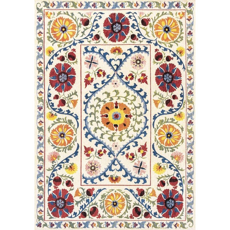 SUZANI ORIGINE 9728 zachwyca tradycyjnym wzorem przywodzącym na myśl ręcznie haftowane tkaniny. Kolorystyka oscyluje wokół naturalnych barw: beżu, ecru, zgaszonych błękitów. Dywan doskonale pasuje do stylu vintage i etno, tworząc harmonijną bazę dla różnych dodatków.