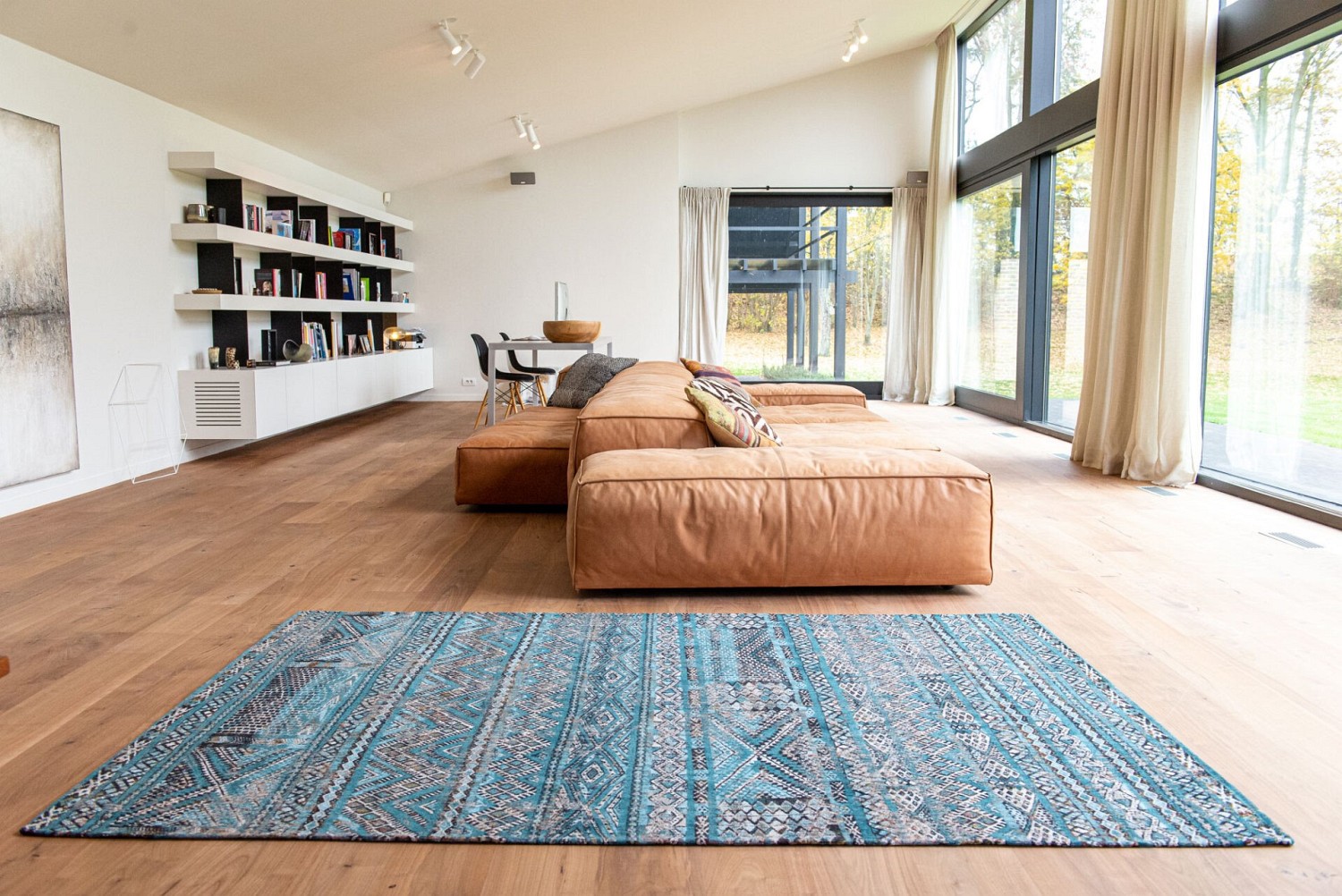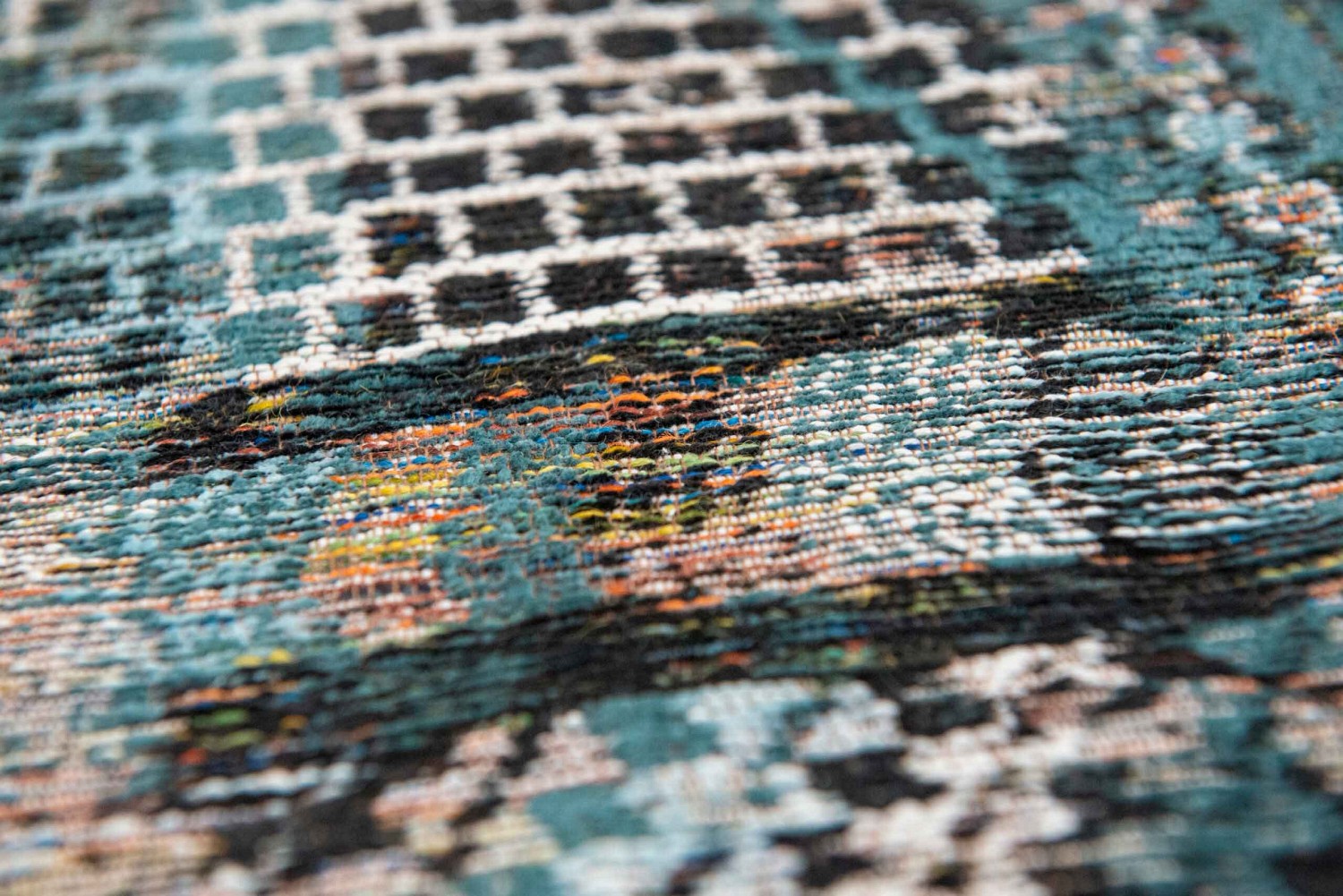Wielokolorowy dywan kilmowy - ZEMMURI BLUE 9110, prestiżowa belgijska marka Louis De Poortere, z kolekcji Antiquarian. Wykonany jest z 85% bawełny szenilowej (z dodatkiem 15% wełny), co sprawia, że dywan jest przyjemny w dotyku, poprawia akustykę pomieszczenia, a oddychająca struktura utrzymuje ciepło, nie dopuszczając do kurzu i chemikaliów, oczyszczając w ten sposób powietrze . Twój oddech Tkanie płaskie z gęstym splotem żakardowym pozwala uzyskać bardzo szczegółowy i szczegółowy wzór, zapewniając jednocześnie wytrzymałość i, bardziej niż grube dywany, odporność na odkształcenia pod ciężarem mebli. Ponadto dywan jest łatwy w utrzymaniu czystości dzięki niskiemu włosiu, które łatwo się odkurza. Dzięki gumowej powłoce na spodzie maty mata jest stabilna i nie przesuwa się. Materiał, z którego wykonana jest wykładzina ma niską palność, ale zachowuje wysoką przewodność cieplną (certyfikat), dzięki czemu doskonale sprawdza się zarówno w pomieszczeniach kominkowych, jak i ogrzewaniu podłogowym.