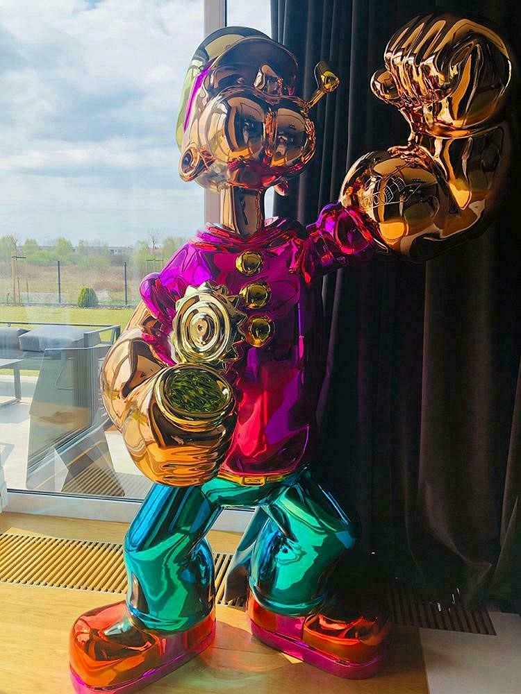 Figura Popeya, najsłynniejszego marynarza. Prawdziwa gratka dla każdego fana tego dzielnego bohatera. Popeye imponuje i zachwyca nie tylko swoimi żywymi kolorami, lecz przede wszystkim wymiarami. Ma 185 cm wysokości oraz 110 cm szerokości. W całości wykonany jest z włókna szklanego. Będzie doskonałą ozdobą i strażnikiem każdego domu. Świetnie sprawdzi się w roli bramkarza w niejednym klubie. Jest świetnym modelem do zdjęć. Jeżeli lubisz ekstrawagancki styl i masz duże poczucie humoru, Popeye może być twoim kumplem. Waga: 125 kg Waga z opakowaniem: 150 kg Sposób dostawy: Transport dedykowany Produkt złożony: Tak