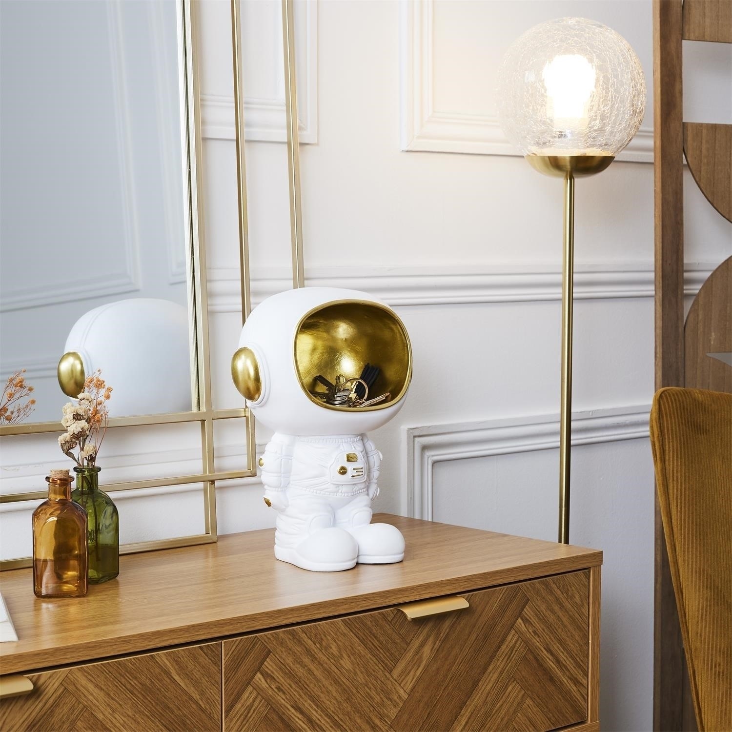 Figurka astronauty to nietuzinkowy element dekoracyjny, który oferuje przestrzeń do przechowywania drobiazgów. Połączenie bieli i złota nadaje wnętrzu nowoczesnego charakteru.