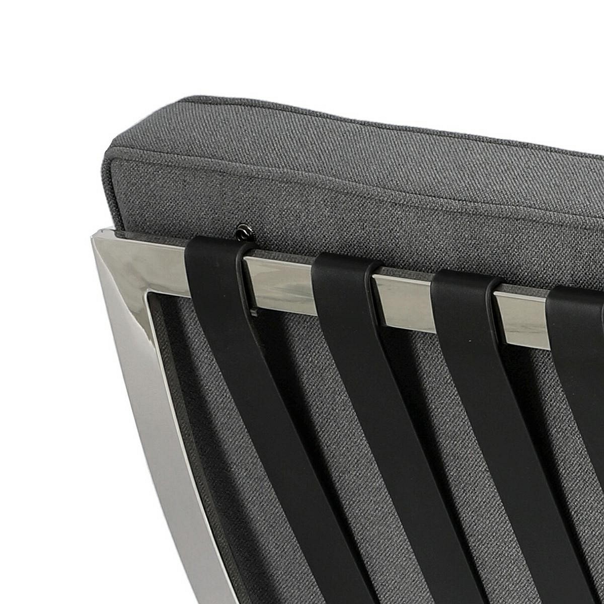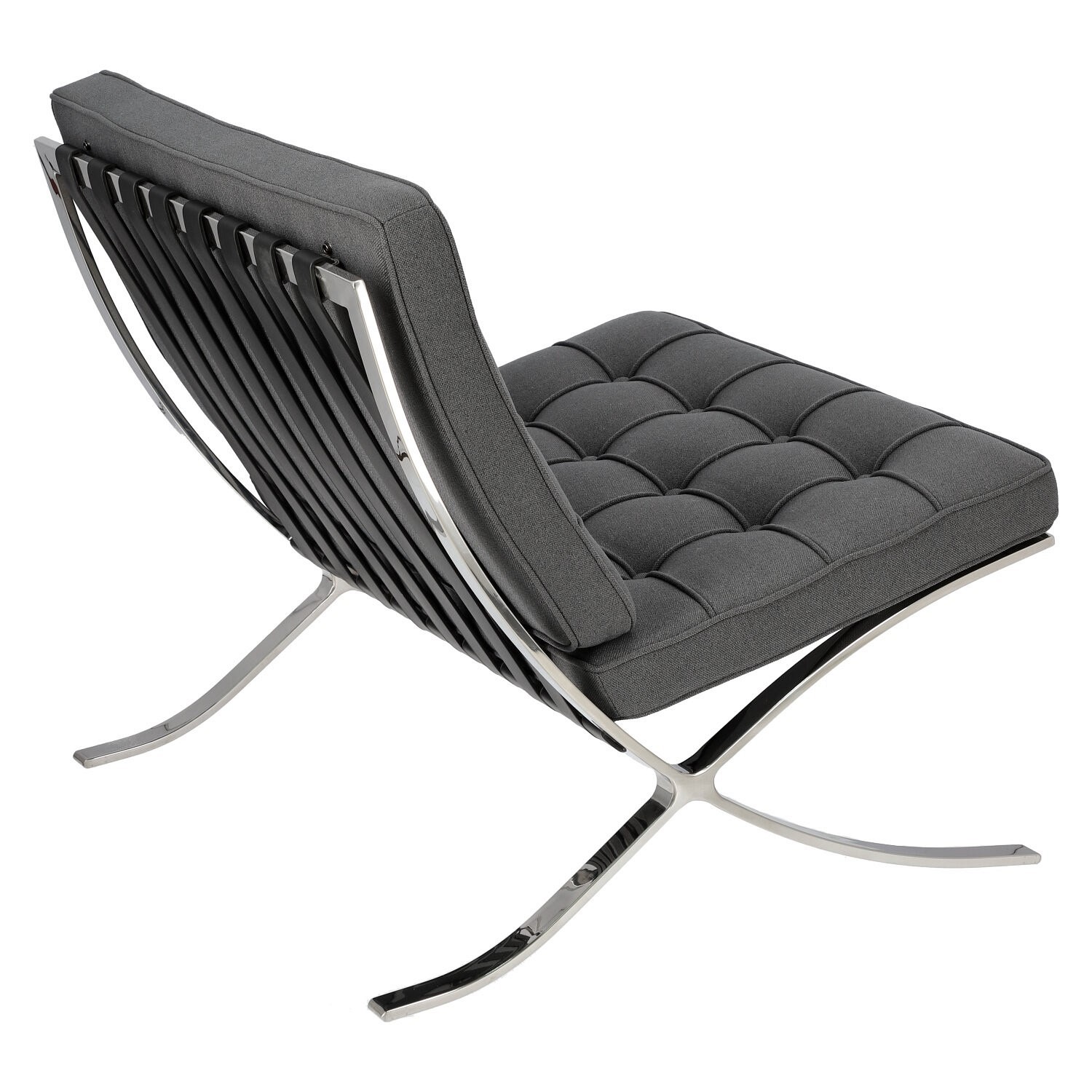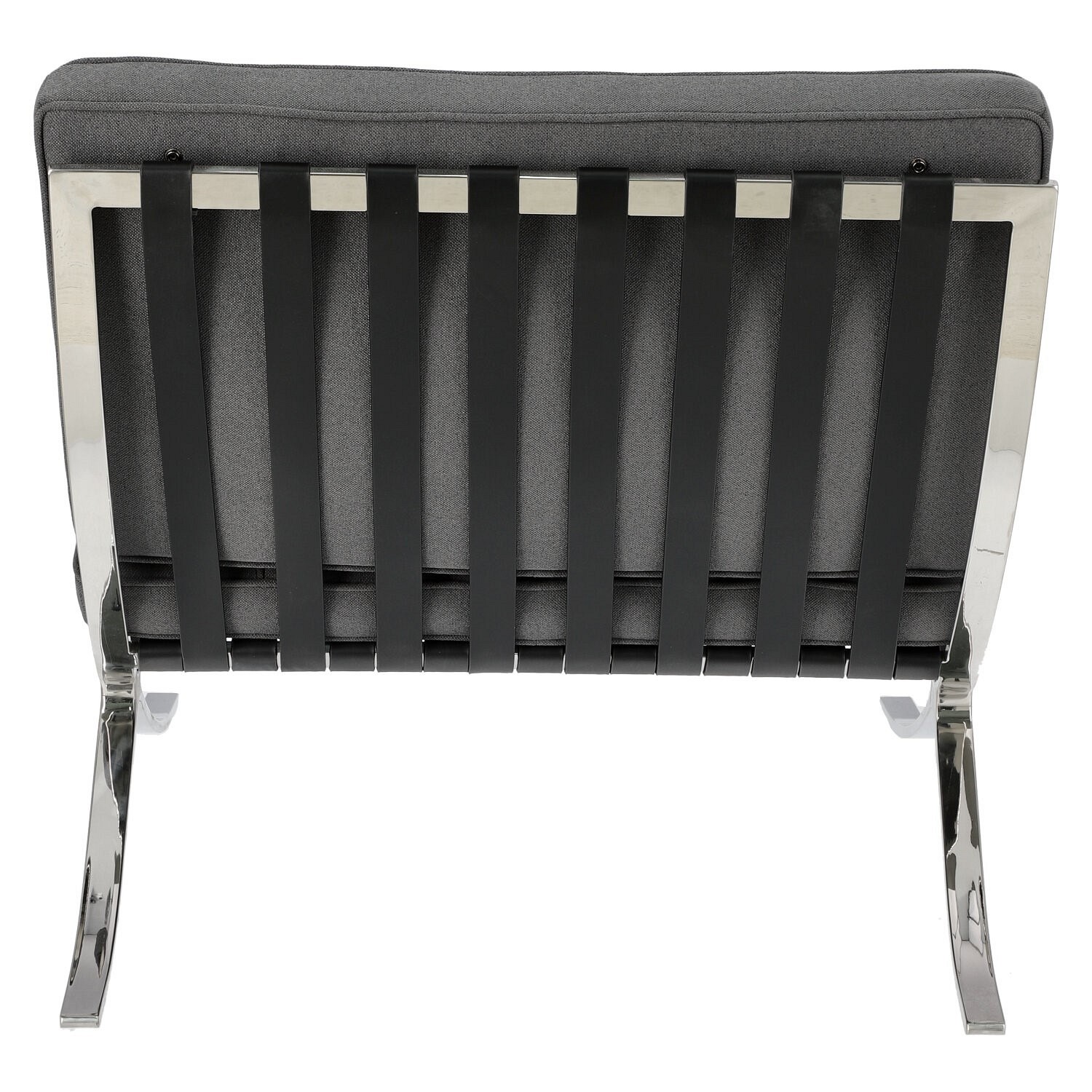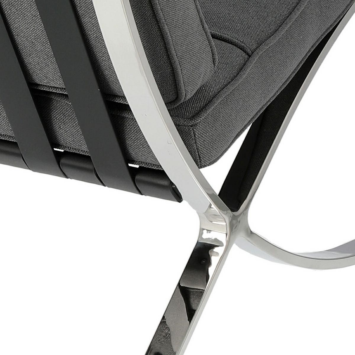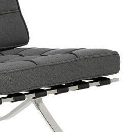 Fotel BA1 z miękkiej tkaniny w kolorze szarym to model inspirowany słynnym projektem Barcelona z 1929 roku. Pikowana tapicerka została przymocowana do chromowanej podstawy za pomocą skórzanych pasków. Oryginalna forma oraz iksowate nóżki fotela tapicerowanego BA1 to klasyka designu ceniona mimo upływu lat. Połączenie lekkiej podstawy z chromowanej stali z obszernym tapicerowanym siedziskiem pozwoliło stworzyć niezwykle wygodny fotel, który stał się synonimem luksusu i elegancji. Tkanina użyta do poduszek fotela jest bardzo łatwa w czyszczeniu, a zarazem trudno palna i spełnia normy ognioodporne.