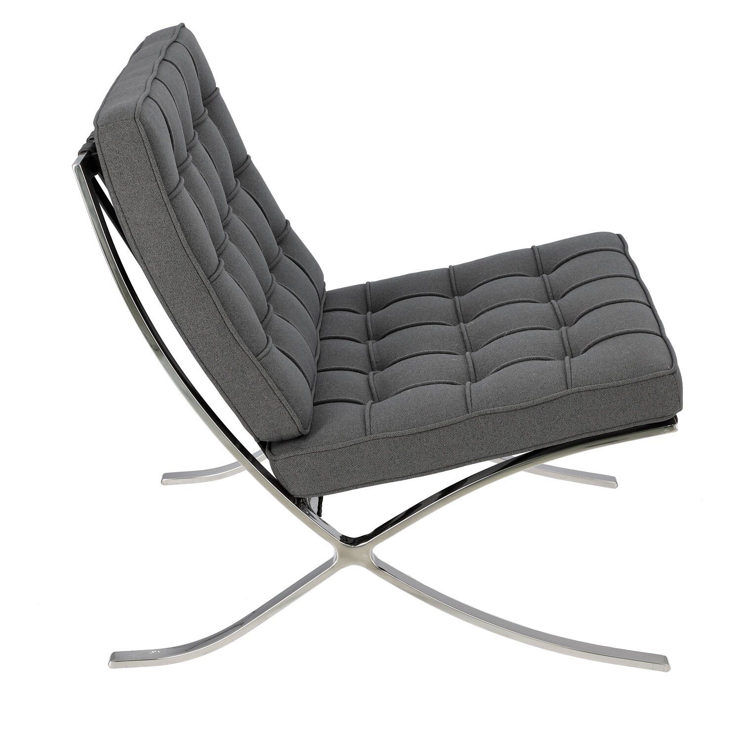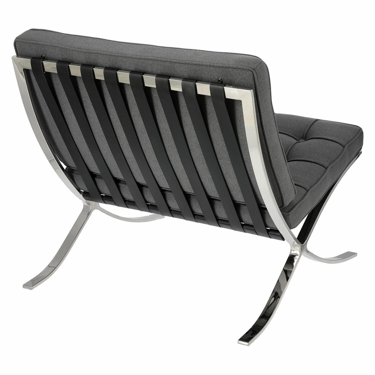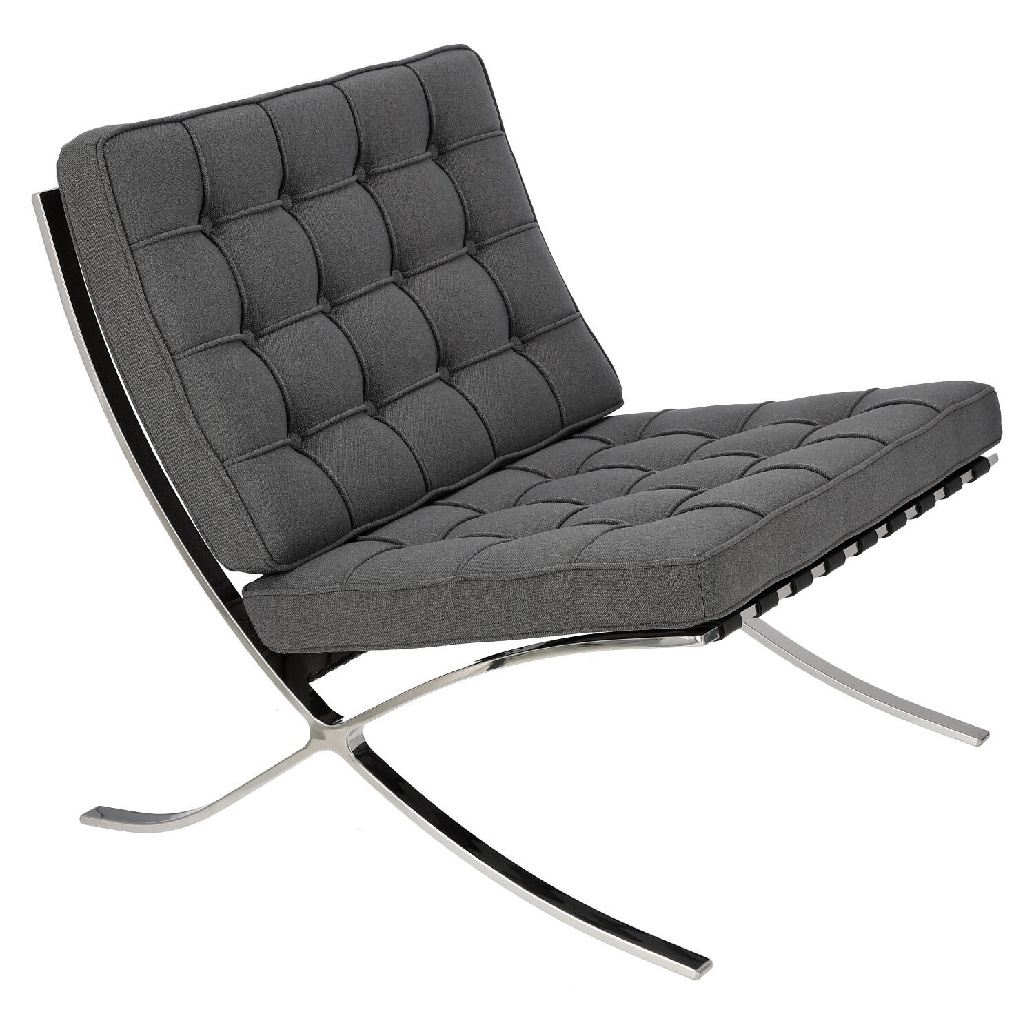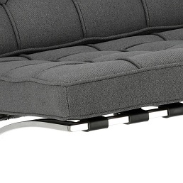 Fotel BA1 z miękkiej tkaniny w kolorze szarym to model inspirowany słynnym projektem Barcelona z 1929 roku. Pikowana tapicerka została przymocowana do chromowanej podstawy za pomocą skórzanych pasków. Oryginalna forma oraz iksowate nóżki fotela tapicerowanego BA1 to klasyka designu ceniona mimo upływu lat. Połączenie lekkiej podstawy z chromowanej stali z obszernym tapicerowanym siedziskiem pozwoliło stworzyć niezwykle wygodny fotel, który stał się synonimem luksusu i elegancji. Tkanina użyta do poduszek fotela jest bardzo łatwa w czyszczeniu, a zarazem trudno palna i spełnia normy ognioodporne.