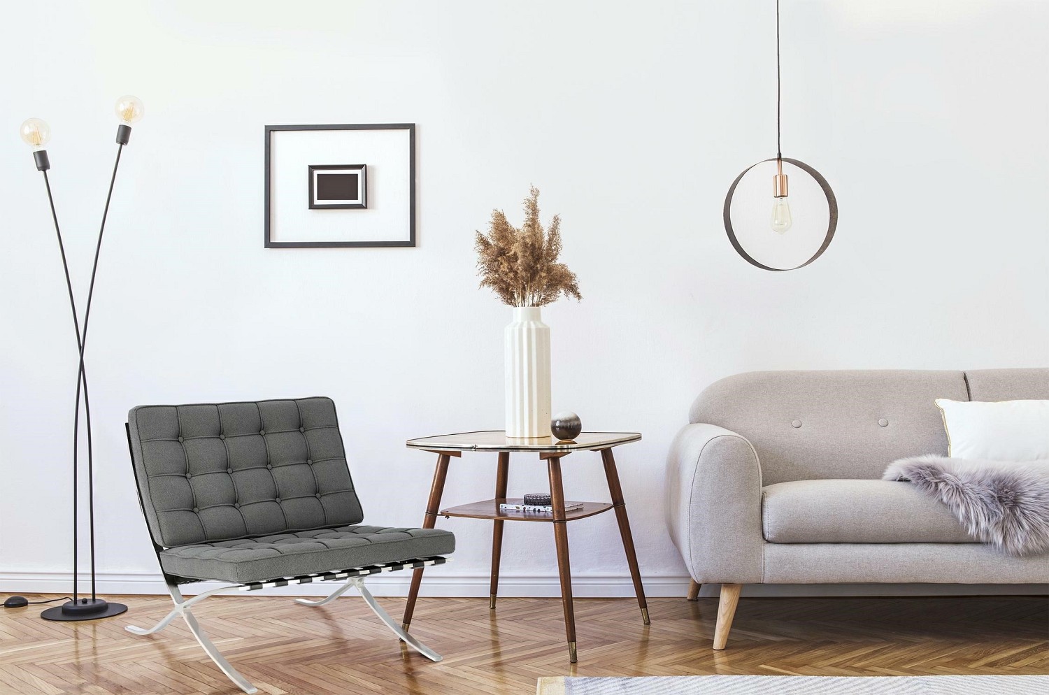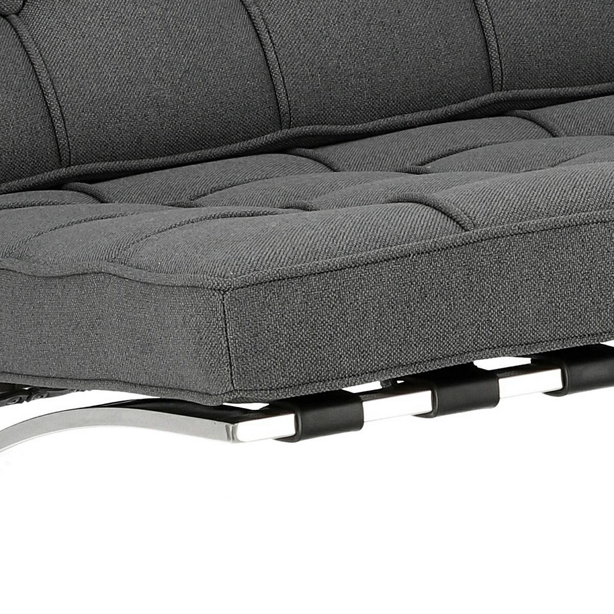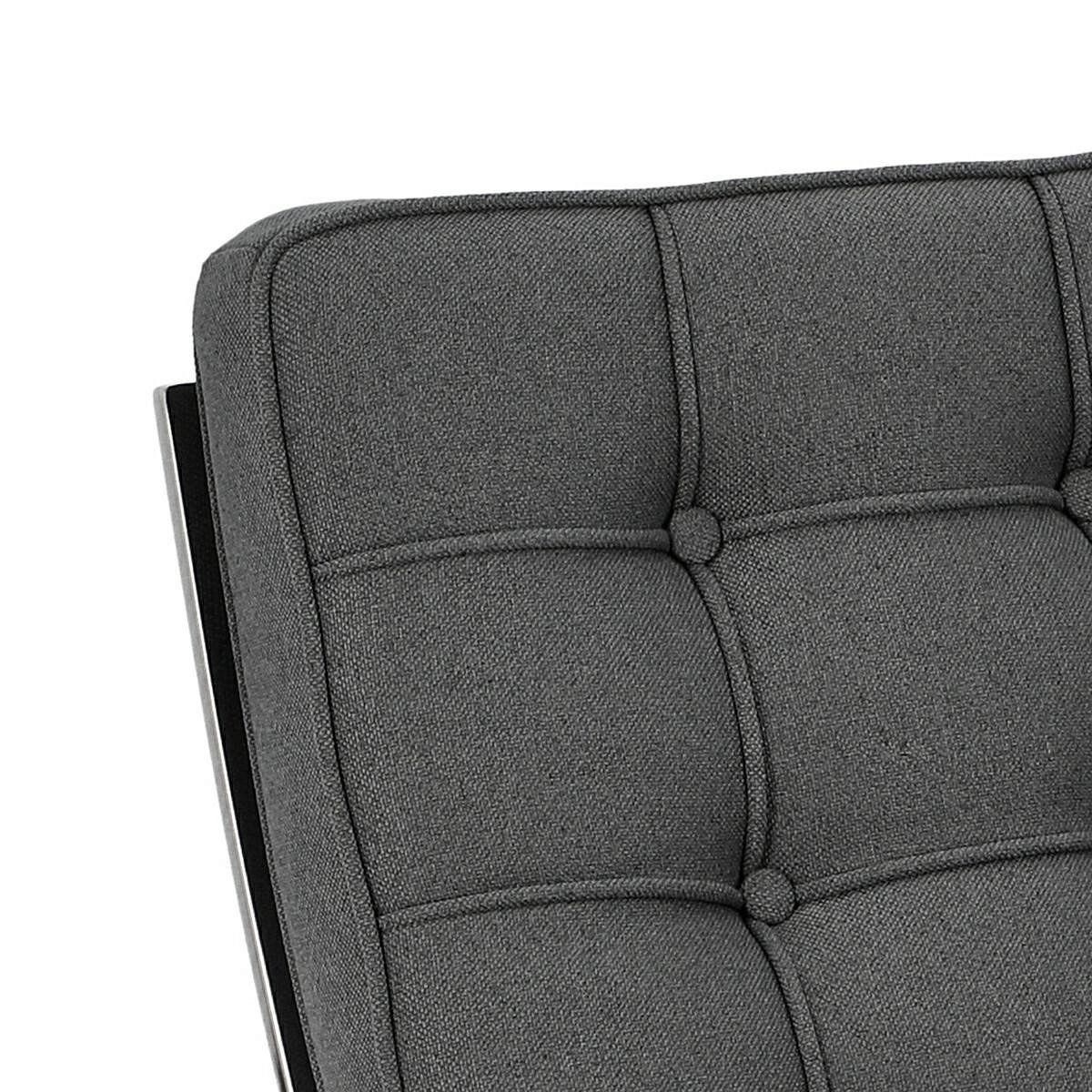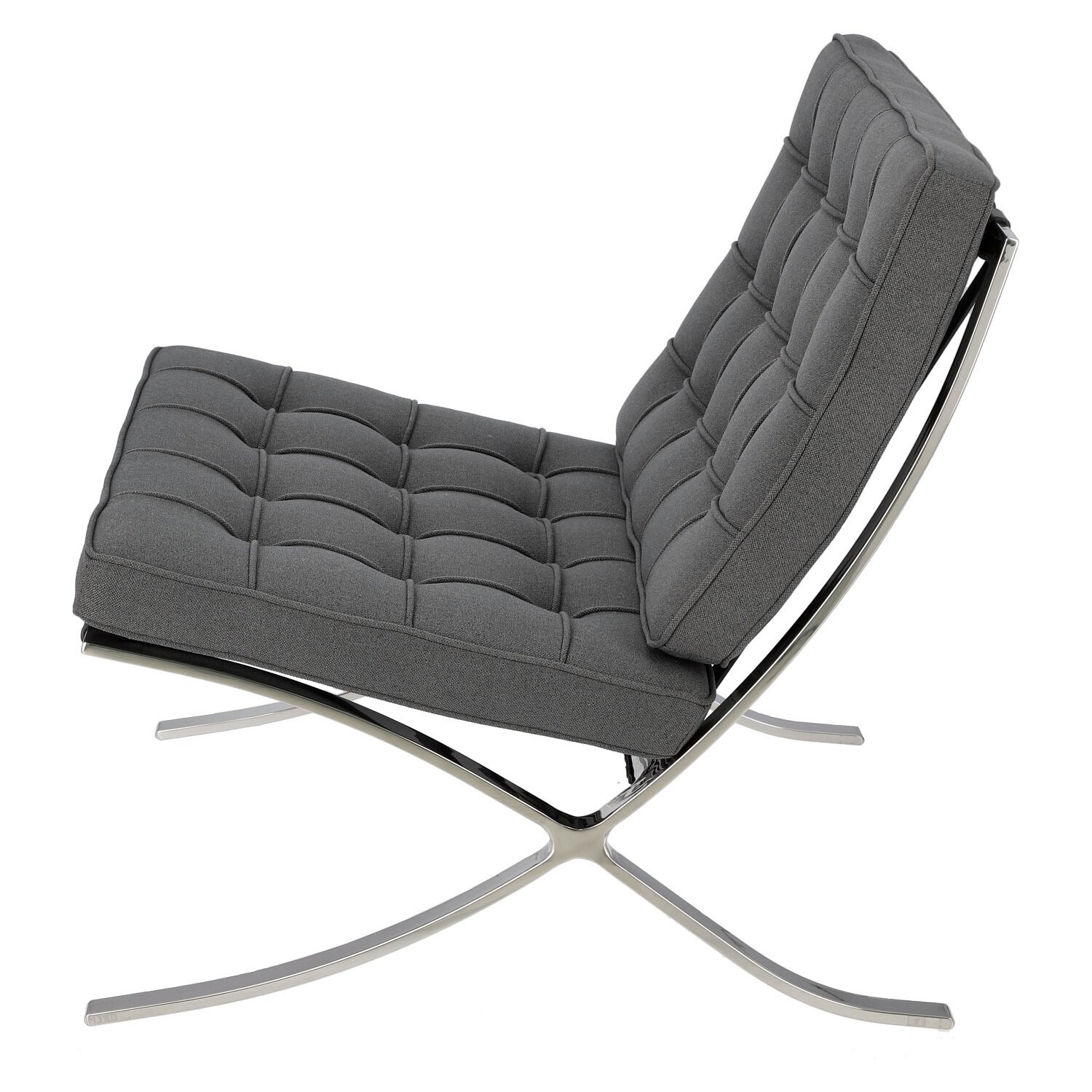 Fotel BA1 z miękkiej tkaniny w kolorze szarym to model inspirowany słynnym projektem Barcelona z 1929 roku. Pikowana tapicerka została przymocowana do chromowanej podstawy za pomocą skórzanych pasków. Oryginalna forma oraz iksowate nóżki fotela tapicerowanego BA1 to klasyka designu ceniona mimo upływu lat. Połączenie lekkiej podstawy z chromowanej stali z obszernym tapicerowanym siedziskiem pozwoliło stworzyć niezwykle wygodny fotel, który stał się synonimem luksusu i elegancji. Tkanina użyta do poduszek fotela jest bardzo łatwa w czyszczeniu, a zarazem trudno palna i spełnia normy ognioodporne.