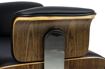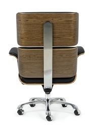 Fotel biurowy LOUNGE BUSINESS czarny z orzechowym drewnem. Siedzisko, oparcie oraz podłokietniki tapicerowane są włoską skórą naturalną w kolorze czarnym. Korpus fotela został wykonany z giętego na ciepło drewna w kolorze orzechowym o grubości 55 mm. Podstawa oraz elementy metalowe wykonane zostały ze stali polerowanej. Fotel wyposażony jest w obrotową podstawę z cichymi kółeczkami. Dodatkowo posiada regulację wysokości, siły oporu oparcia z blokadą i funkcję bujania. Lounge Business doskonale sprawdzi się w gabinecie, domowym biurze lub sali konferencyjnej. Szerokość siedziska: 49 cm Waga netto: 27 kg Waga z opakowaniem: 33 kg Maksymalna ilość szt. w opakowaniu: 1 Sposób wysyłki: Paleta Wymiary opakowania: 79 cm x 61 cm x 94 cm Produkt do samodzielnego montażu: Tak
