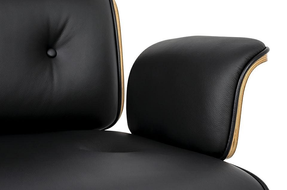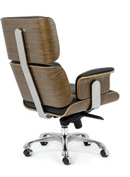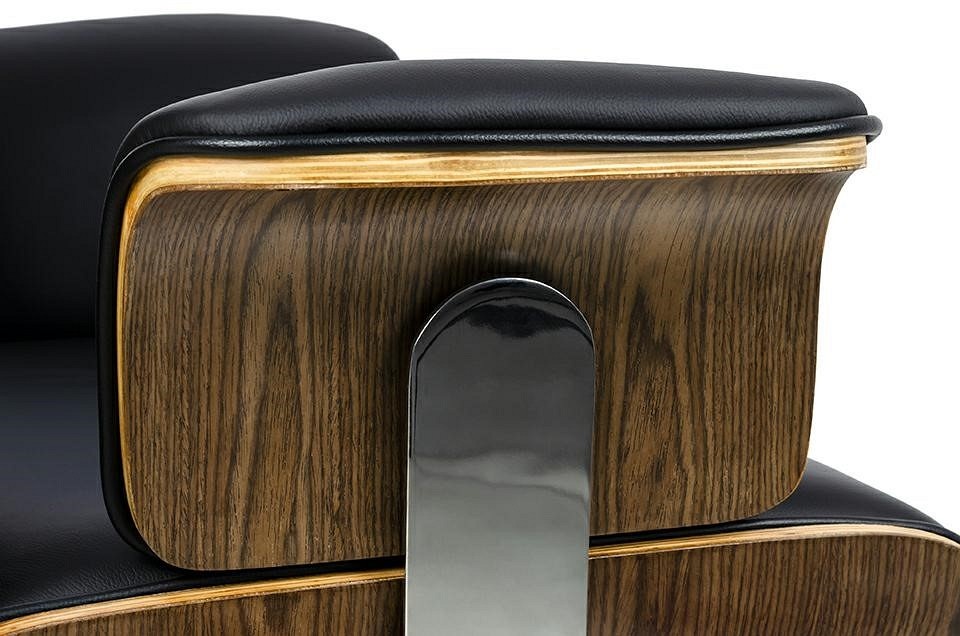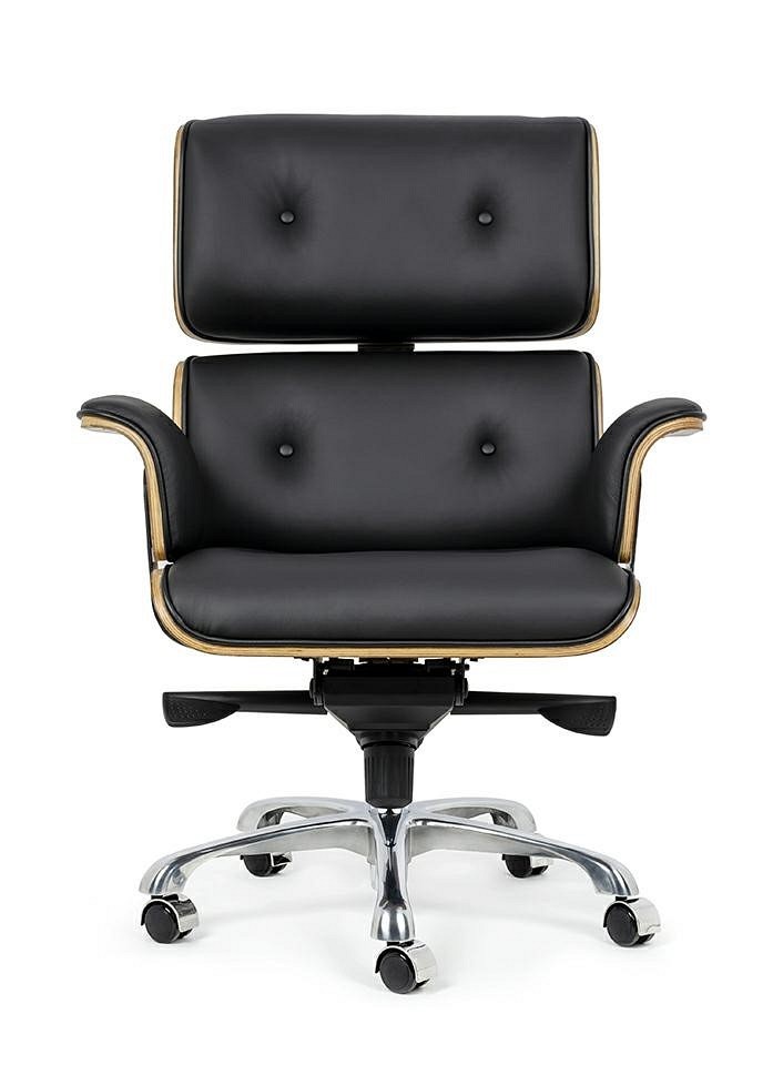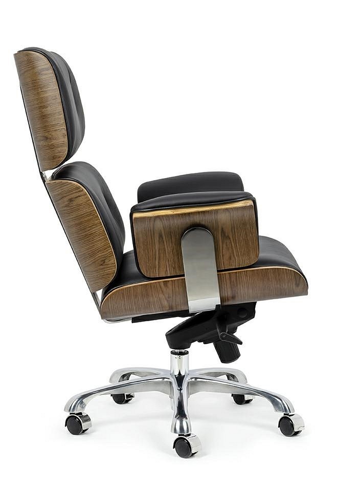Fotel biurowy LOUNGE BUSINESS czarny z orzechowym drewnem. Siedzisko, oparcie oraz podłokietniki tapicerowane są włoską skórą naturalną w kolorze czarnym. Korpus fotela został wykonany z giętego na ciepło drewna w kolorze orzechowym o grubości 55 mm. Podstawa oraz elementy metalowe wykonane zostały ze stali polerowanej. Fotel wyposażony jest w obrotową podstawę z cichymi kółeczkami. Dodatkowo posiada regulację wysokości, siły oporu oparcia z blokadą i funkcję bujania. Lounge Business doskonale sprawdzi się w gabinecie, domowym biurze lub sali konferencyjnej. Szerokość siedziska: 49 cm Waga netto: 27 kg Waga z opakowaniem: 33 kg Maksymalna ilość szt. w opakowaniu: 1 Sposób wysyłki: Paleta Wymiary opakowania: 79 cm x 61 cm x 94 cm Produkt do samodzielnego montażu: Tak