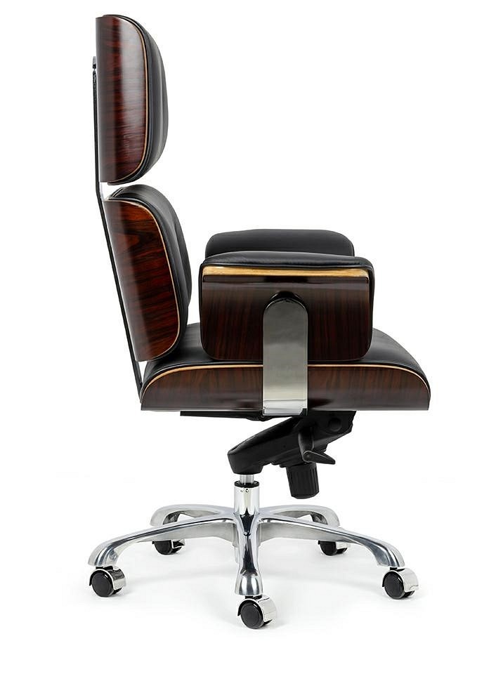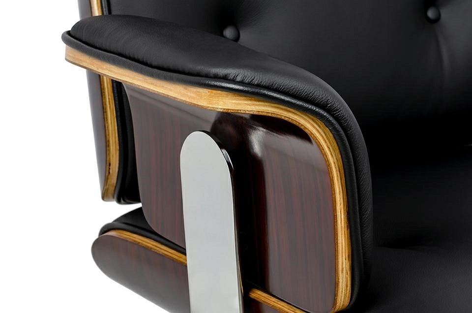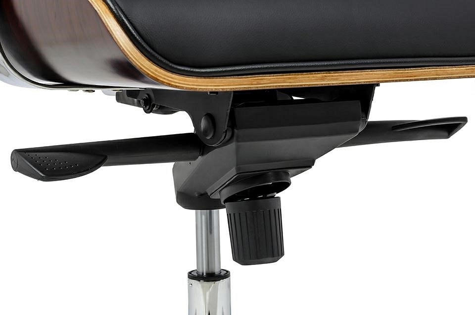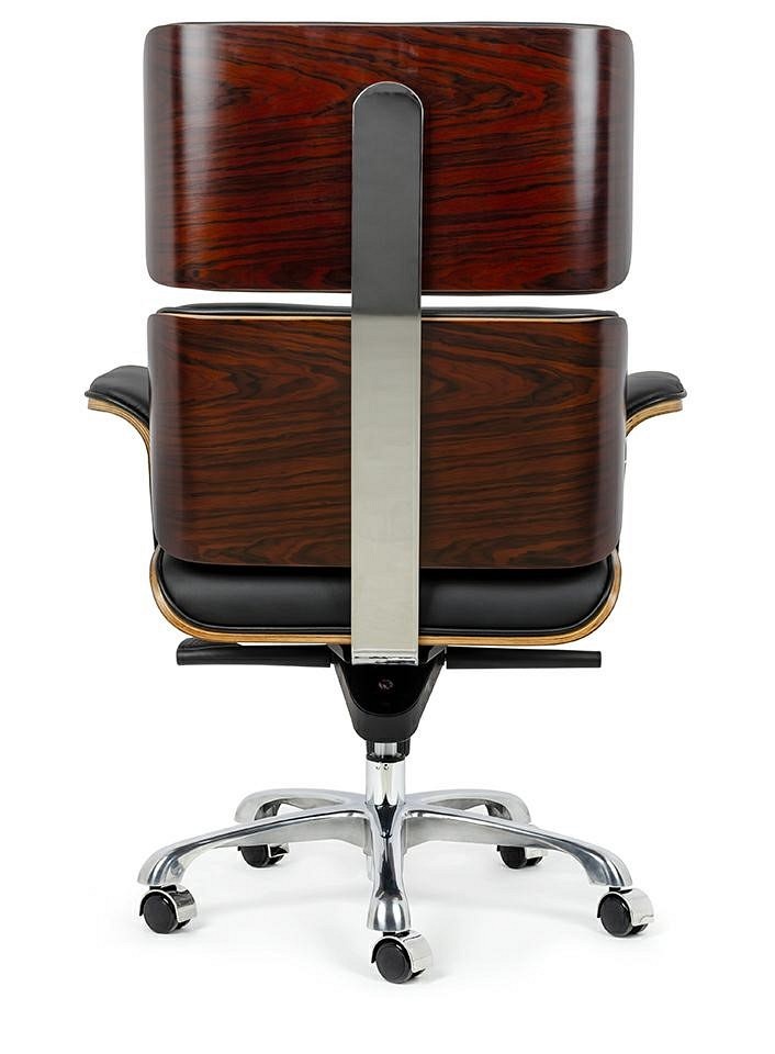 Fotel biurowy LOUNGE BUSINESS czarny z różanym drewnem. Siedzisko, oparcie oraz podłokietniki tapicerowane są włoską skórą naturalną w kolorze czarnym. Korpus fotela został wykonany z giętego na ciepło drewna w kolorze różanym o grubości 55 mm. Podstawa oraz elementy metalowe wykonane zostały ze stali polerowanej. Fotel wyposażony jest w obrotową podstawę z cichymi kółeczkami. Dodatkowo posiada regulację wysokości, siły oporu oparcia z blokadą i funkcję bujania. Lounge Business doskonale sprawdzi się w gabinecie, domowym biurze lub sali konferencyjnej. Szerokość siedziska: 49 cm Waga netto: 27 kg Waga z opakowaniem: 33 kg Maksymalna ilość szt. w opakowaniu: 1 Sposób wysyłki: Paleta Wymiary opakowania: 79 cm x 61 cm x 94 cm Produkt do samodzielnego montażu: Tak