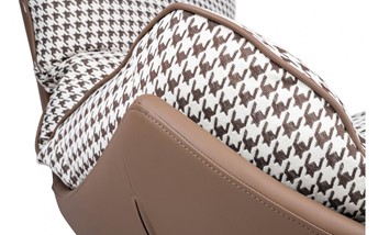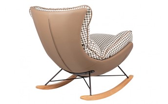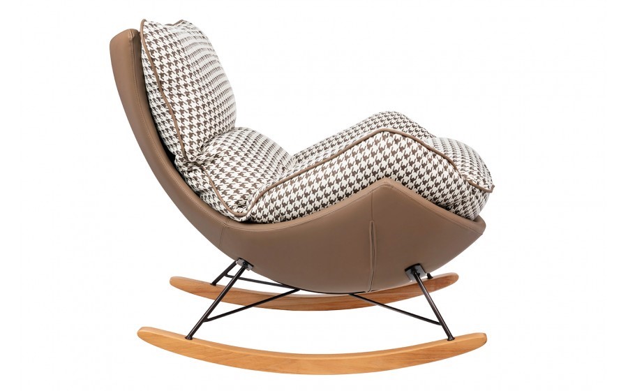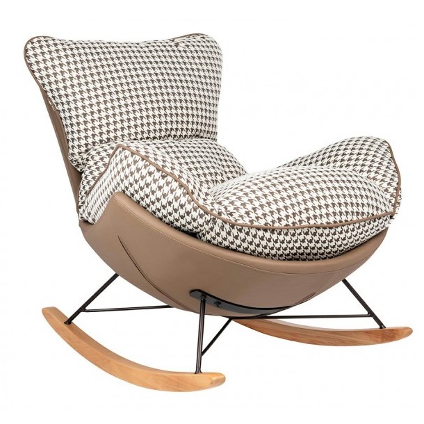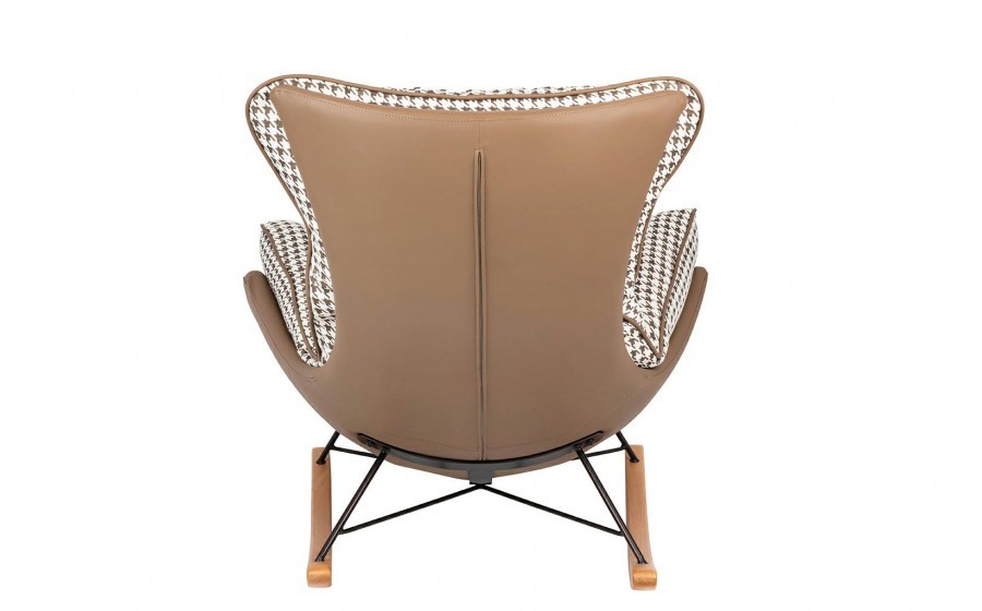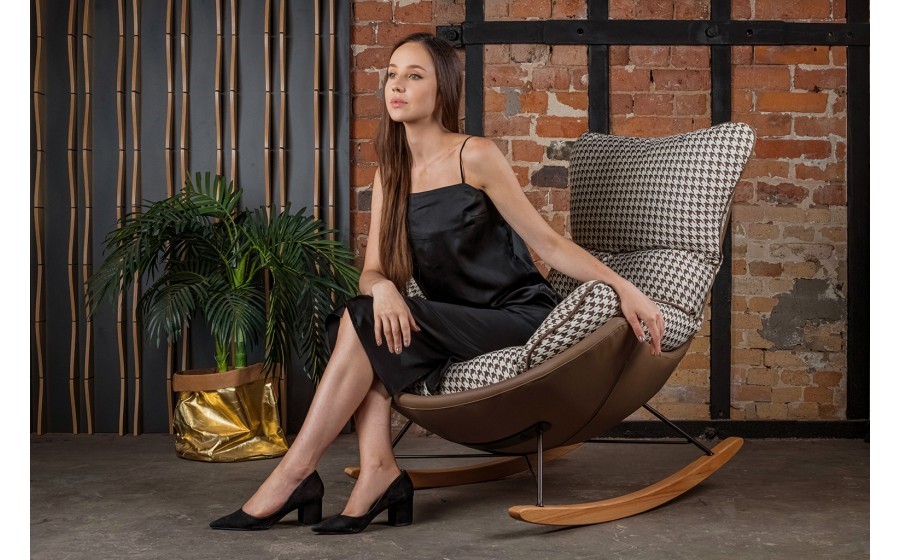 Fotel bujany OTILIA to niezwykła kombinacja przytulnego designu, wyjątkowej wygody i elegancji, która wniesie do każdego wnętrza wyjątkowy klimat. Jego korpus, tapicerowany ekoskórą o ciepłym brązowym odcieniu, nie tylko dodaje mu szyku, ale również podkreśla wysoką jakość materiałów użytych do produkcji. Wartością dodaną fotela OTILIA jest miękka poducha, obszyta delikatną beżowo-brązową tkaniną w pepitkowym wzorze. Ta subtelna kombinacja barw nadaje fotelowi nie tylko unikalny charakter, ale także sprawia, że staje się on eleganckim akcentem w każdym pomieszczeniu. Drewniane płozy, na których spoczywa fotel, nie tylko dodają mu naturalnego uroku, ale również ocieplają wnętrze, tworząc harmonijną równowagę między nowoczesnym designem a tradycyjnym rzemiosłem. Fotel OTILIA nie tylko zachwyca swoim wyglądem, ale także zapewnia niesamowitą wygodę, zachęcając do relaksu i wypoczynku.