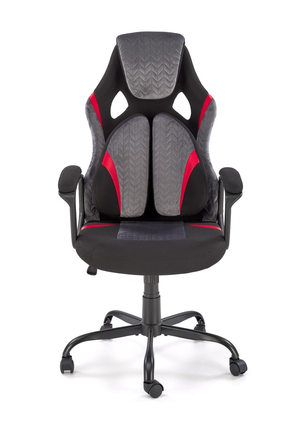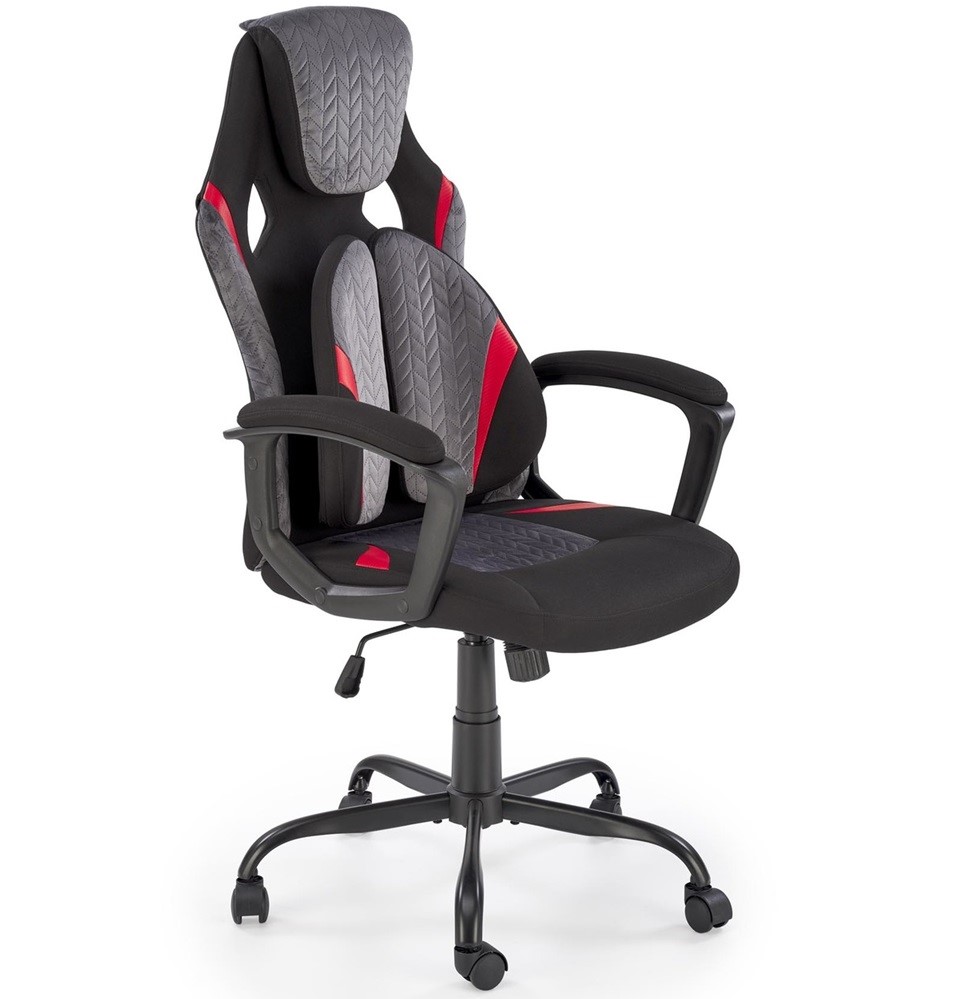 Fotel JENSEN prezentuje się wyjątkowo nowocześnie dzięki połączeniu różnych faktur materiału oraz kolorystycznemu zestawieniu czerni, szarości i czerwonych wstawek.
