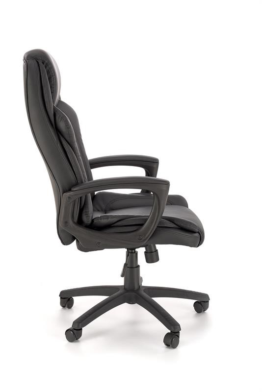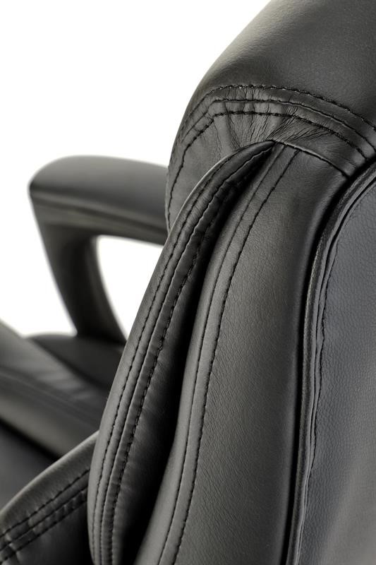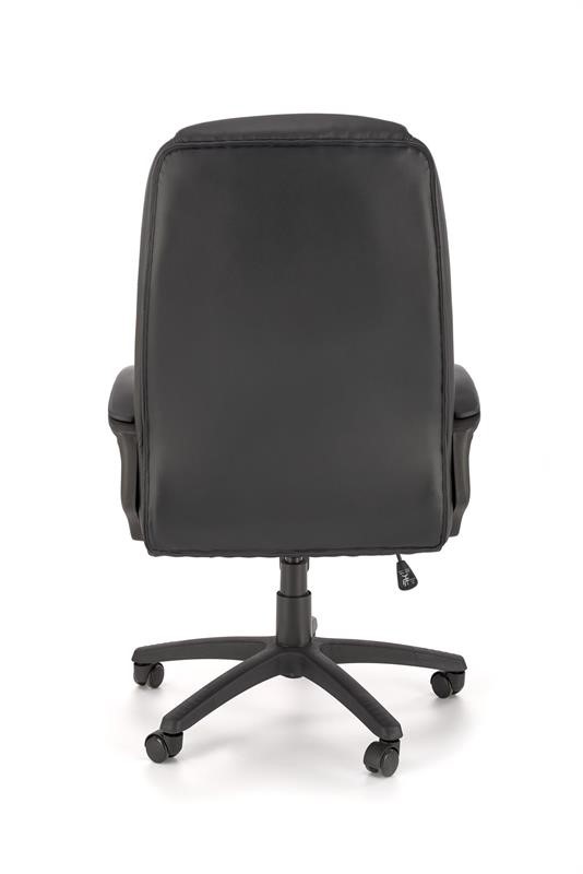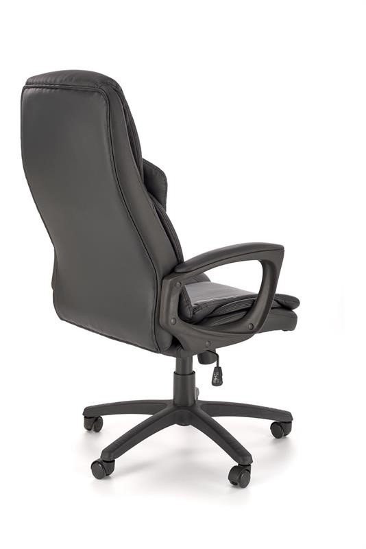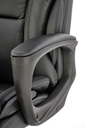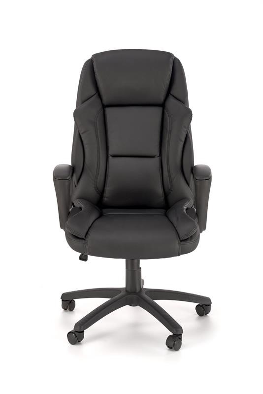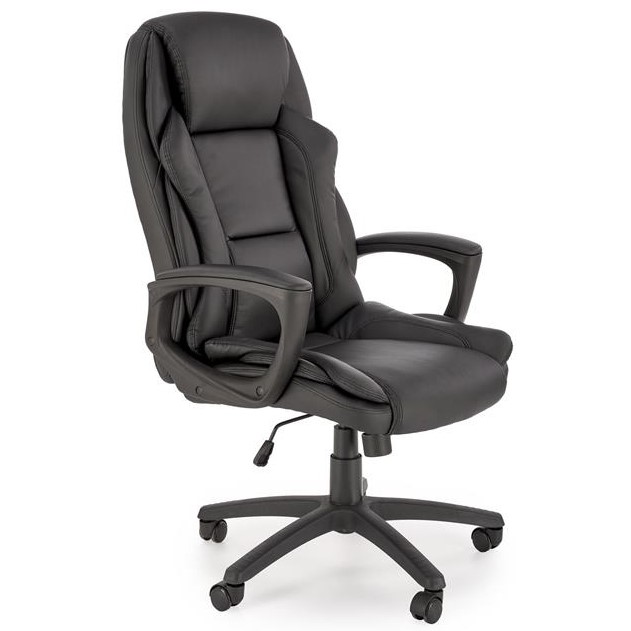 Fotel został wykonany z wysokiej jakości eco skóry w klasycznym czarnym kolorze, co nadaje mu nowoczesny i profesjonalny wygląd. Wyprofilowane oparcie oraz siedzisko zapewniają odpowiednie wsparcie dla kręgosłupa, co jest szczególnie istotne podczas długotrwałego siedzenia.