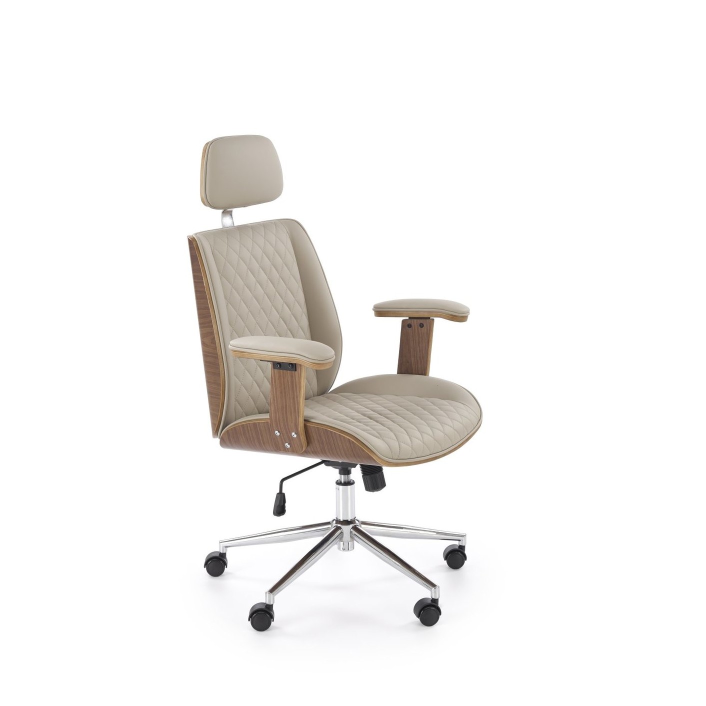 Fotel gabinetowy TIMBER to elegancki mebel łączący klasyczny design z nowoczesnymi rozwiązaniami, idealny do biura czy gabinetu. Wykonany z giętej sklejki w kolorze orzechowym oraz tapicerowany ekoskórą w odcieniu beżowym, zapewnia estetyczny wygląd i trwałość. Fotel wyposażony jest w mechanizm TILT, umożliwiający swobodne bujanie się oraz blokadę w pozycji pionowej, co zwiększa komfort użytkowania. Tapicerowane podłokietniki dodają wygody podczas długotrwałej pracy. Obrotowa podstawa ułatwia poruszanie się i dostęp do różnych części biurka bez konieczności wstawania. To połączenie stylu, komfortu i funkcjonalności, idealne dla osób ceniących wygodę w pracy.