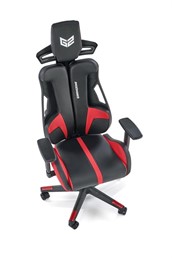 Regulowane podłokietniki zapewniają dodatkowy komfort, umożliwiając dostosowanie ich wysokości i pozycji do preferencji użytkownika. Fotel wykonany jest z wysokiej jakości tkaniny w efektownym czerwono-czarnym kolorze, co nadaje mu dynamiczny i nowoczesny wygląd.